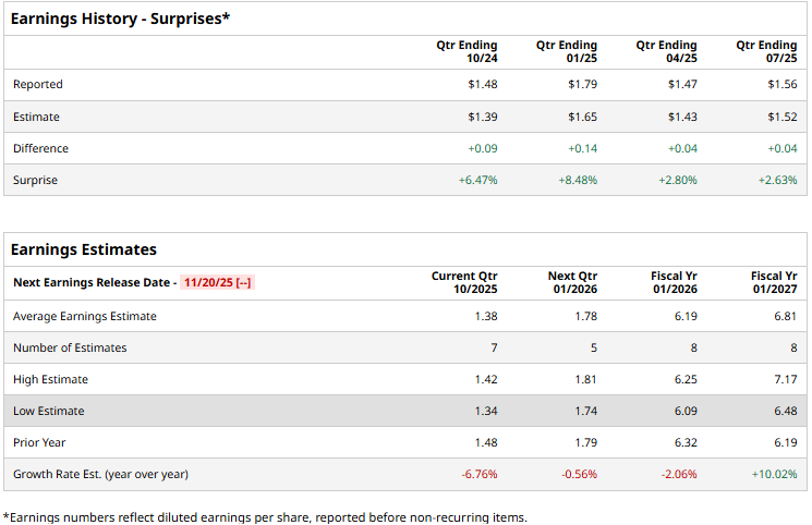 The apparel retailer is gearing up to announce its third-quarter results in the upcoming month. Ahead of the event, Ross Stores is expected to report a profit of $1.38 per share, down 6.8% from $1.48 per share reported in the year-ago quarter. On a more positive note, the company has surpassed the Street’s bottom-line estimates in each of the past four quarters.