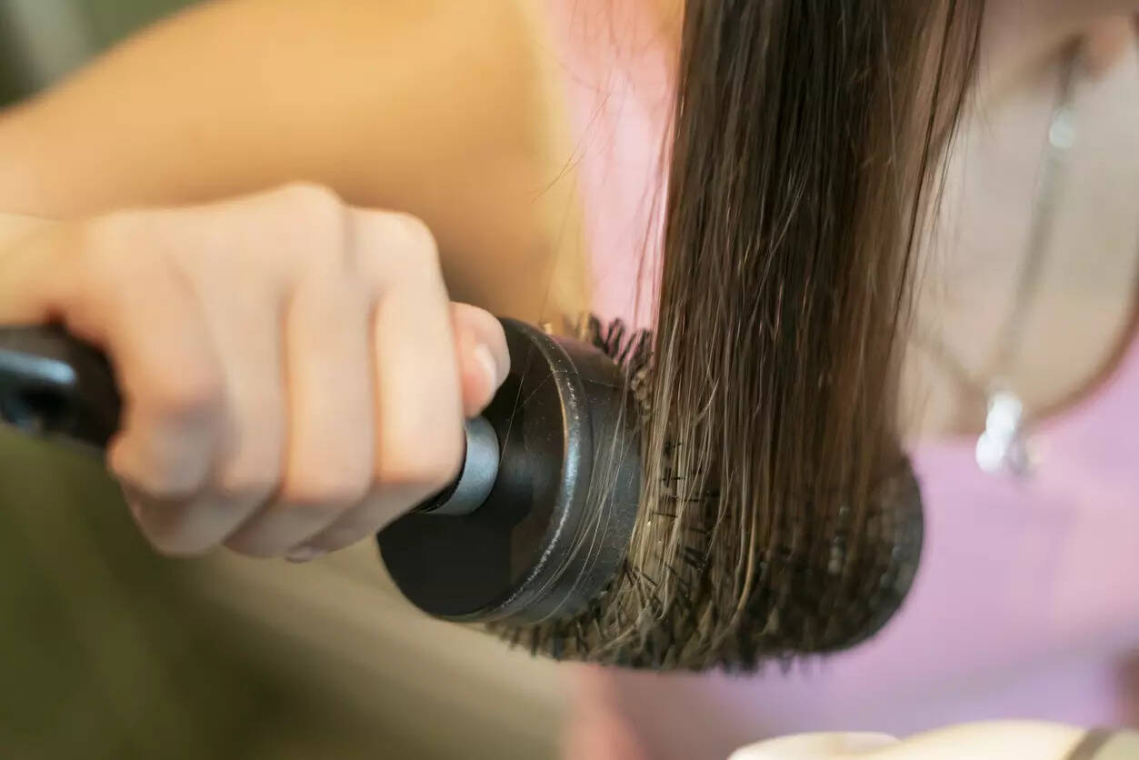 It's crucial that motion never stops while styling your hair. Start by applying the round brush in the following manner: place it at the base of your roots, roll it down to the ends, and dry the brush as you go. One thing to keep in mind is that, regardless of how you move the brush, you should always maintain the blow-nozzle dryer's parallel to the ground and inclined downward to distribute heat evenly across the hair section rather than fluffing it up.
