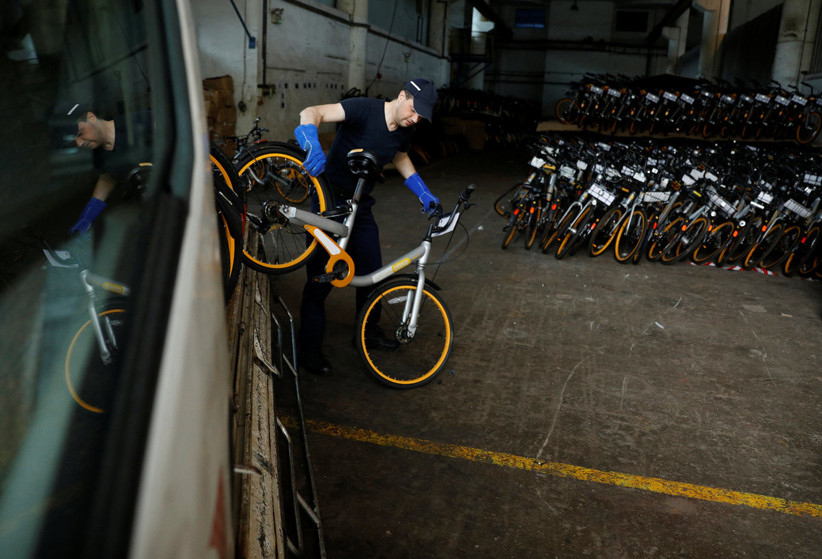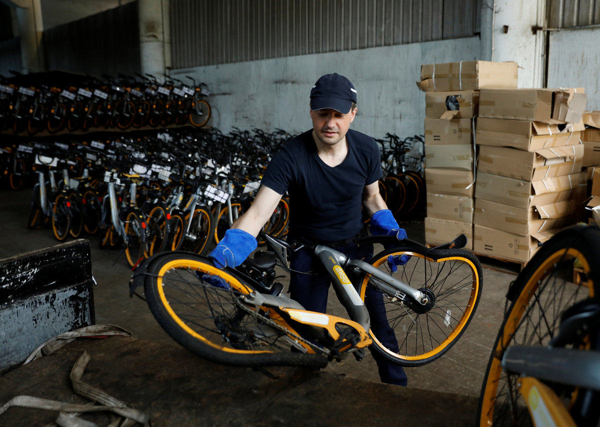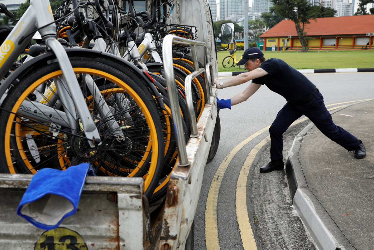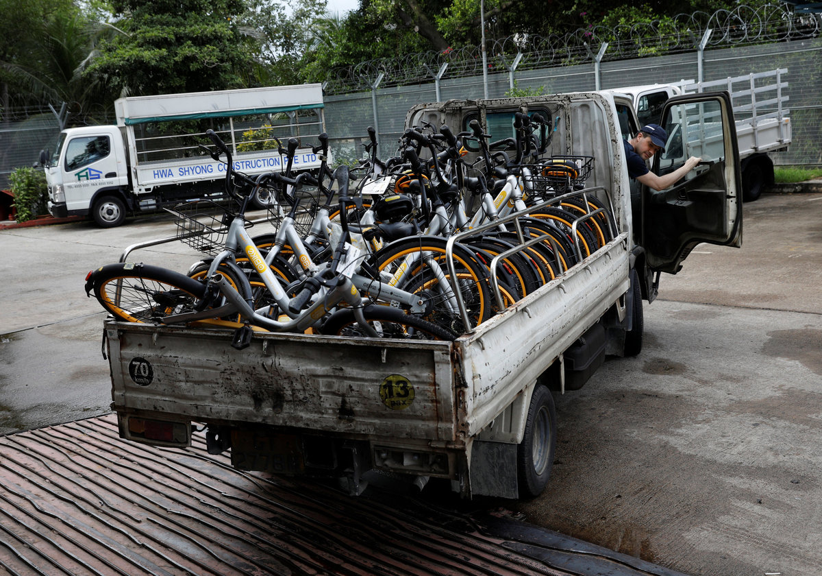 Zhivko Girginov, a Bulgarian living in Singapore, return damaged Obikes to their warehouse after gathering them around his neighbourhood in Singapore December 29, 2017. REUTERS/Edgar Su