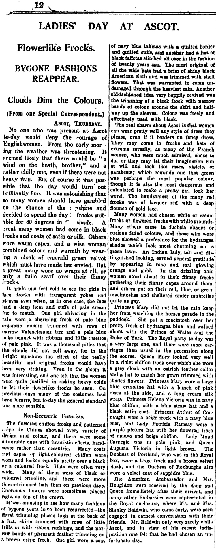 No one who was present to-day would deny the courage of Englishwomen. From the early morning the weather was threatening. It seemed likely that there would be “a wind on the heath, brother,” and a rather chilly one, even if there were not heavy rain. But of course it was possible that the day would turn out brilliantly fine. It was astonishing that so many women should have gambled on the chance of the sunshine and decided to spend the day in frocks suitable for 80 degrees in the shade. A great many women had come in black frocks and coats of satin or silk. Others wore warm capes, and a wise woman combined colour and warmth by wearing a cloak of emerald green velvet which must have made her envied. But the great many wore no wraps at all, or only a tulle scarf over their flimsy frocks.