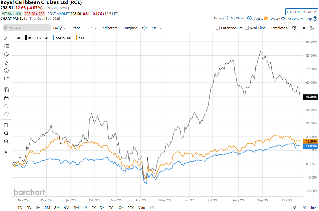 RCL stock prices have soared 48% over the past 52 weeks, notably outperforming the Consumer Discretionary Select Sector SPDR Fund’s (XLY) 17% gains and the S&P 500 Index’s ($SPX) 13.5% gains during the same time frame.