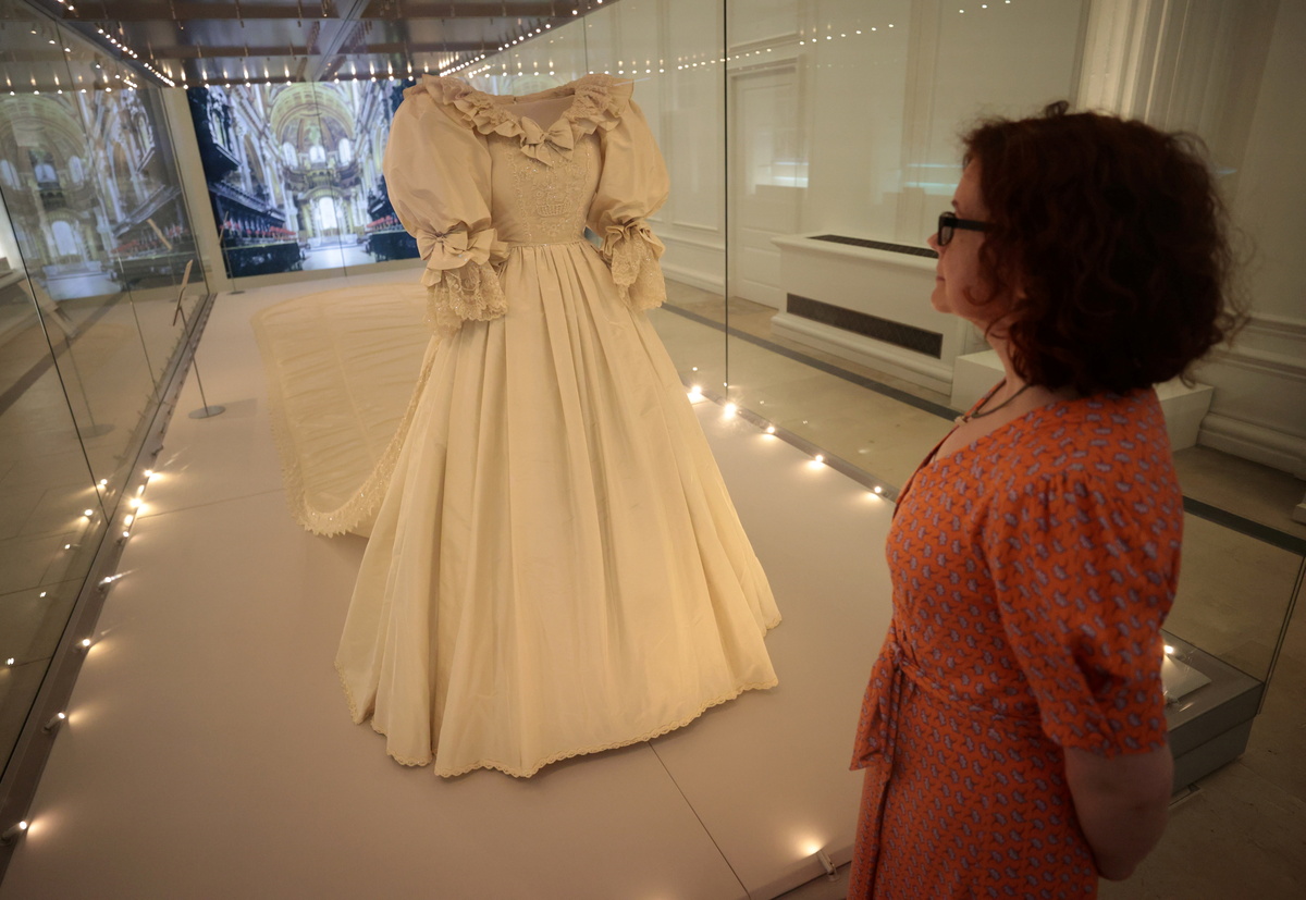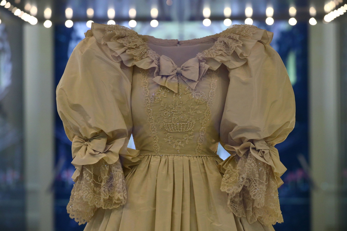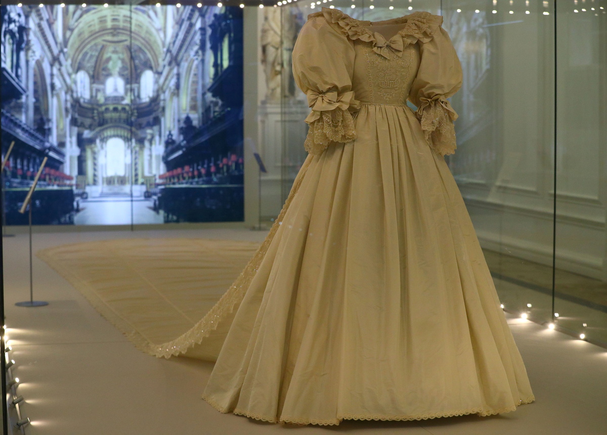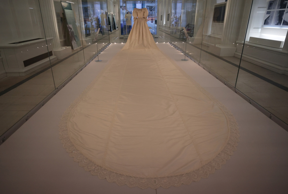 The voluminous ivory dress Princess Diana wore to marry Prince Charles in 1981 has gone on display at her former London home, as part of a new exhibition showcasing a selection of gowns worn by members of Britain's royal family.