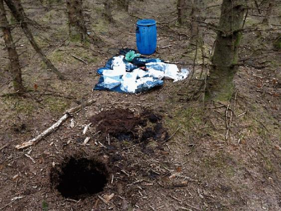 Several pipe bombs, magazines and ammunition for an assault rifle, and bomb component parts and command wires were also concealed in barrels in purpose-built holes in woodland.
