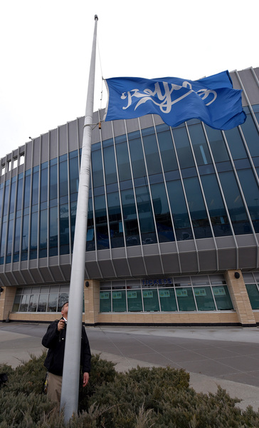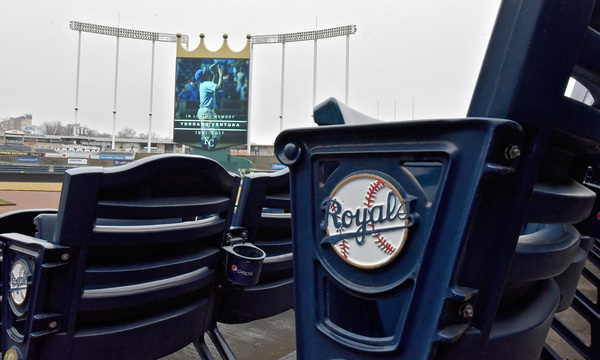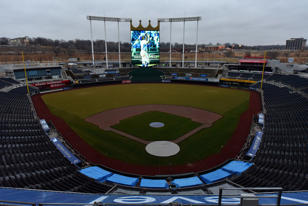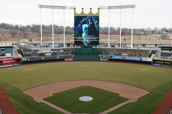 At 11:30 a.m., a Royals employee emerged from a set of double doors and lowered the flags surrounding the stadium to half-staff.