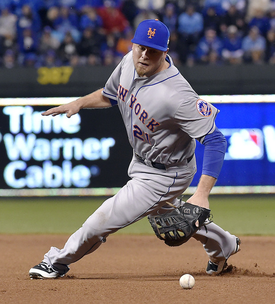 In Game 5, the Royals trailed 2-1 in the top of the ninth inning but had Eric Hosmer at third base with one out. Salvador Perez grounded to third baseman David Wright, who threw to Duda at first base. Hosmer dashed for home and Duda's throw to the plate was off the mark. Hosmer scored and tied the game, which the Royals won 7-2 in 12 innings as they clinched the World Series title.