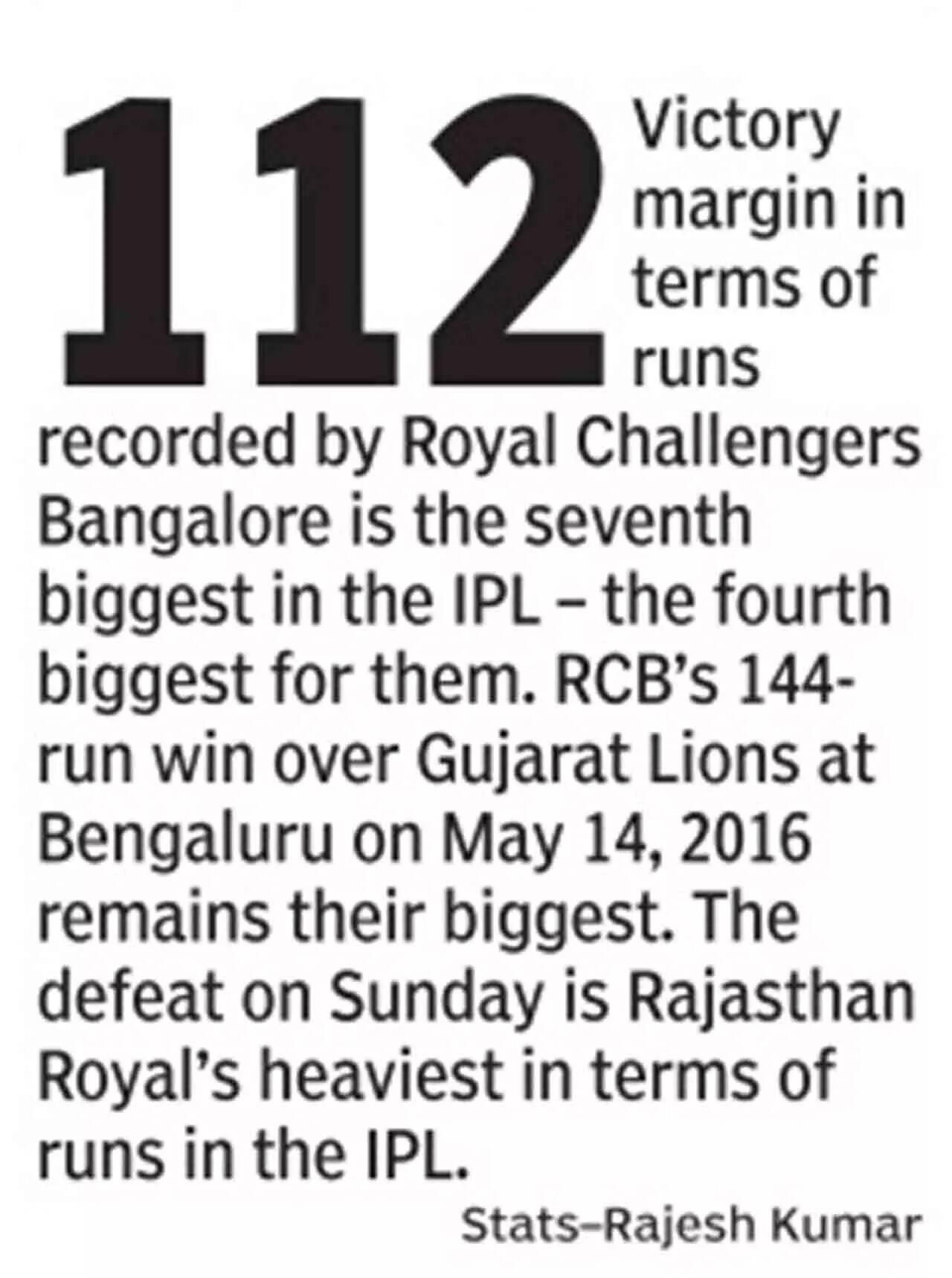 JAIPUR: It was Royals from Bangalore who came out all guns blazing to register a thumping 112 runs victory over Sanju Samson's outfit in a sink-or-swim clash at the SMS Stadium here on Sunday.