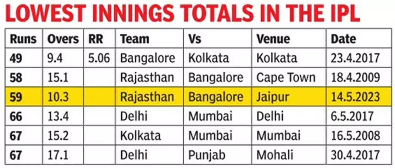 The Royal Challengers Bangalore (RCB) bowlers breathed fire and Rajasthan Royals surrendered meekly in a chase of 172. The hosts were bundled out for 59 in just 10. 3 overs, the third lowest IPL score.