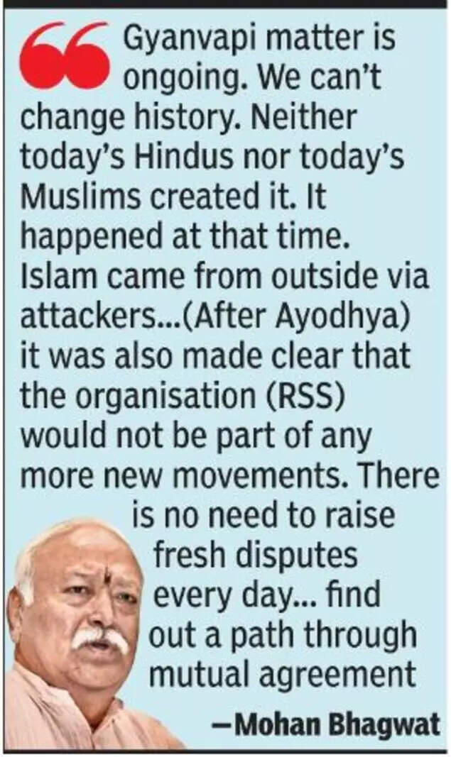 NAGPUR: Striking a note of conciliation amid a rash of claims and counter-claims linked to religious shrines, RSS chief Mohan Bhagwat said Thursday that “there is no need to look for a shivling in every mosque”. He said even the dispute over Varanasi’s Gyanvapi mosque could be resolved amicably by Hindus and Muslims.