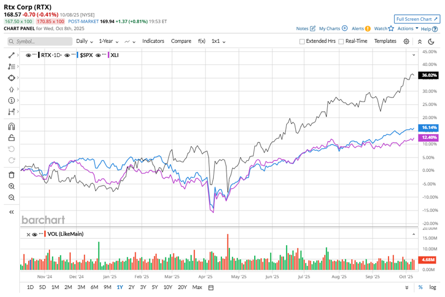 RTX stock has outperformed the S&P 500 Index’s ($SPX) 17.4% gains over the past 52 weeks, with shares up 36.5% during this period. Similarly, it outperformed the Industrial Select Sector SPDR Fund’s (XLI) 14.8% gains over the same time frame.