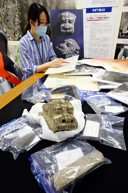 The exhibition is displaying about 150 pieces of rubble and shrapnel that Takeo Watanabe, a defunct University of Tokyo professor who was a part of a group investing the bombing, collected from Hiroshima and Nagasaki in October 1945. The museum is also displaying 14 shishi heads -- guardian lions that are usually found at shrines -- that decorated the archway of the entrance of the cathedral that were previously housed at the research museum at the university.