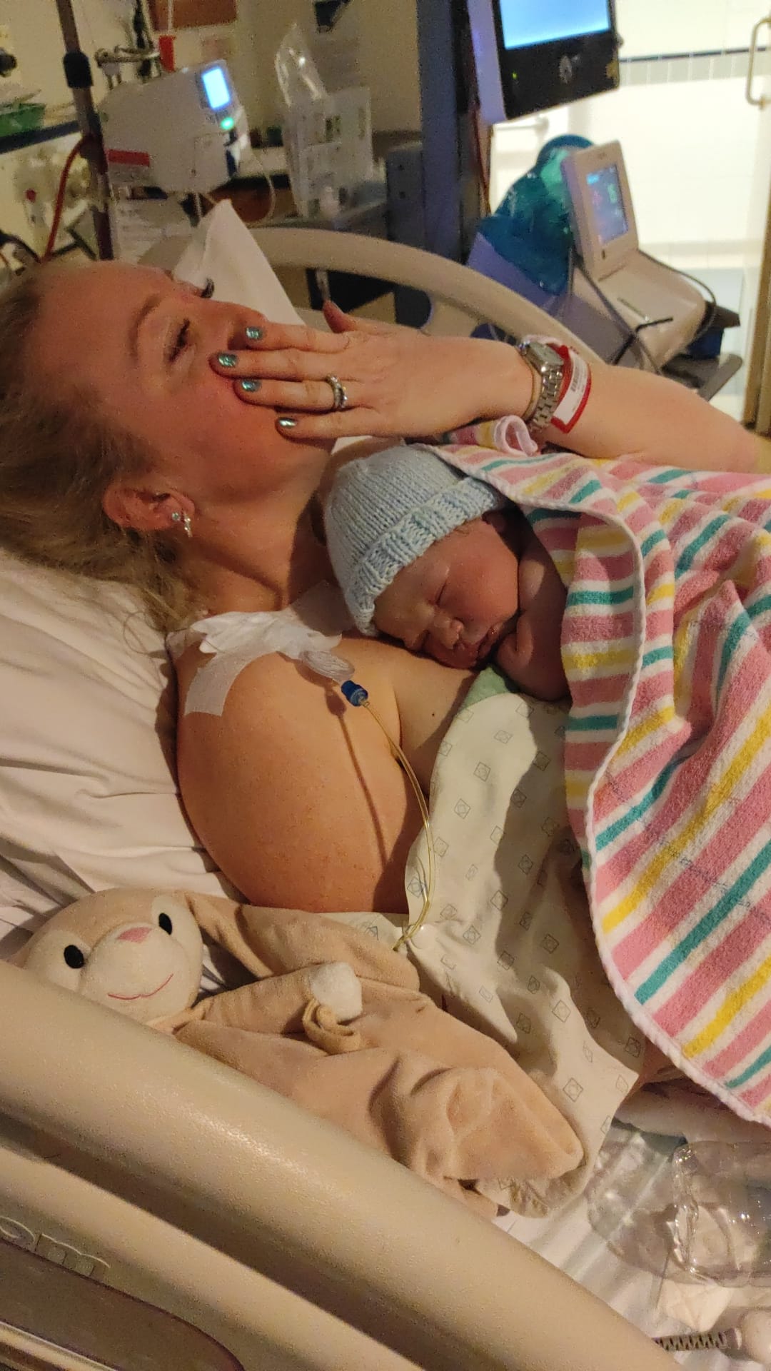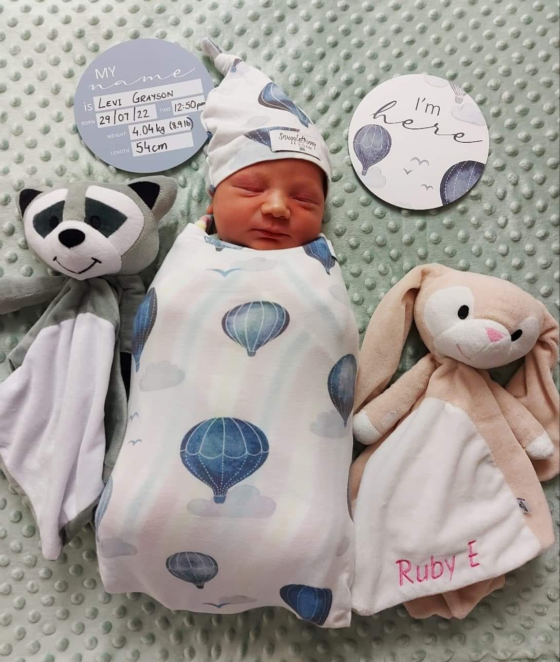 Levi Edwards was born on Friday afternoon in Redlands, east of Brisbane, with Ruby's comforter, embroidered with her name, by his side for some of his first photos.