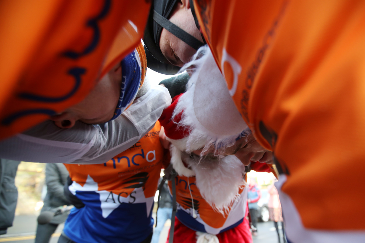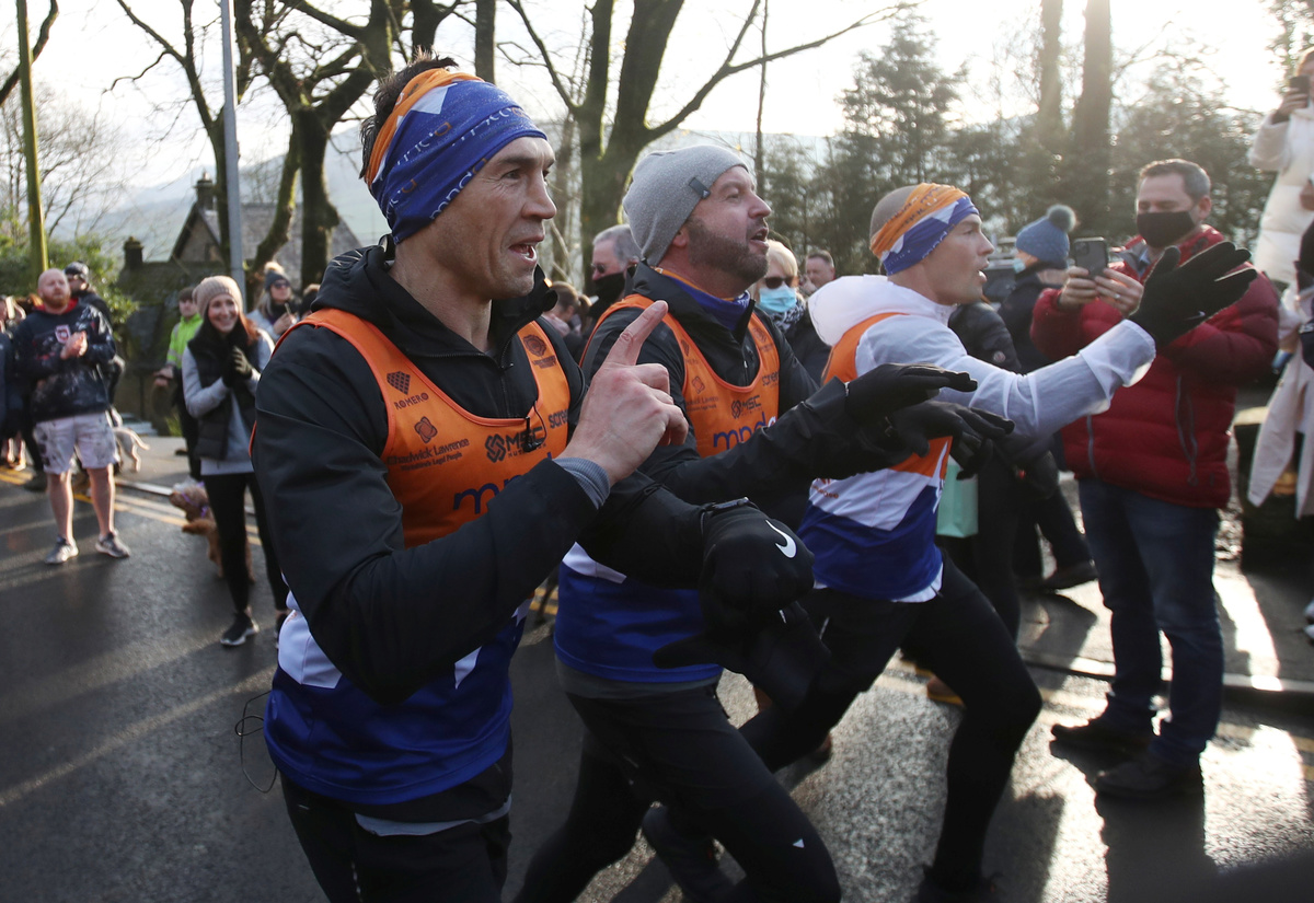 FILE PHOTO: Leeds Rhinos' Director of Rugby Kevin Sinfield and team react after finishing the last of seven marathons in seven days, to raise money and awareness for former teammate Rob Burrow, who sufferes with Motor Neurone Disease, in Saddleworth, December 7, 2020. Action Images via Reuters/Carl Recine