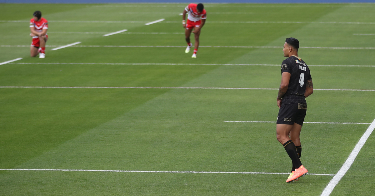 The former Australia rugby union international remained standing as other players and match officials "took a knee" at the Headingley ground in Leeds, England in support of the Black Lives Matter campaign.