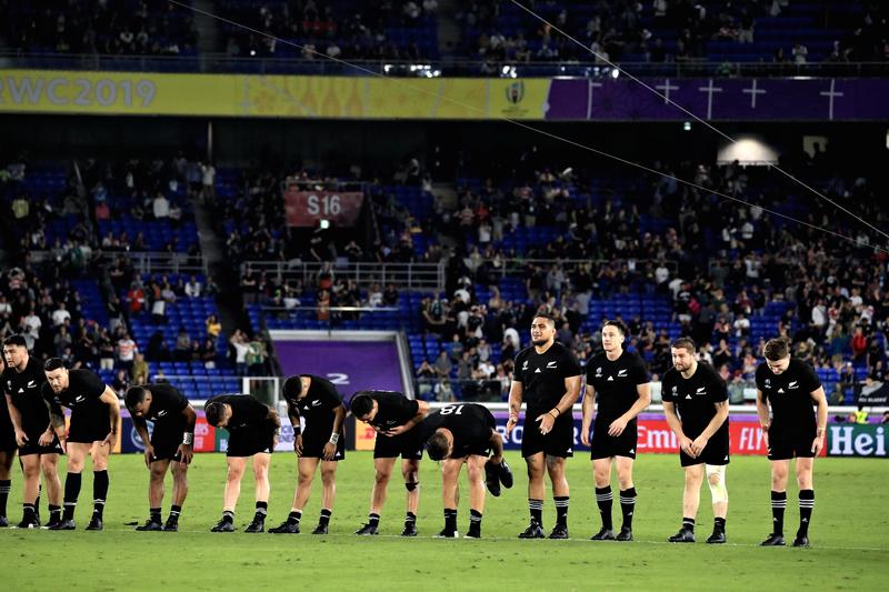 Members of the New Zealand team bowed deeply toward the stands after their Sept. 21 victory over South Africa at International Stadium Yokohama in Yokohama.