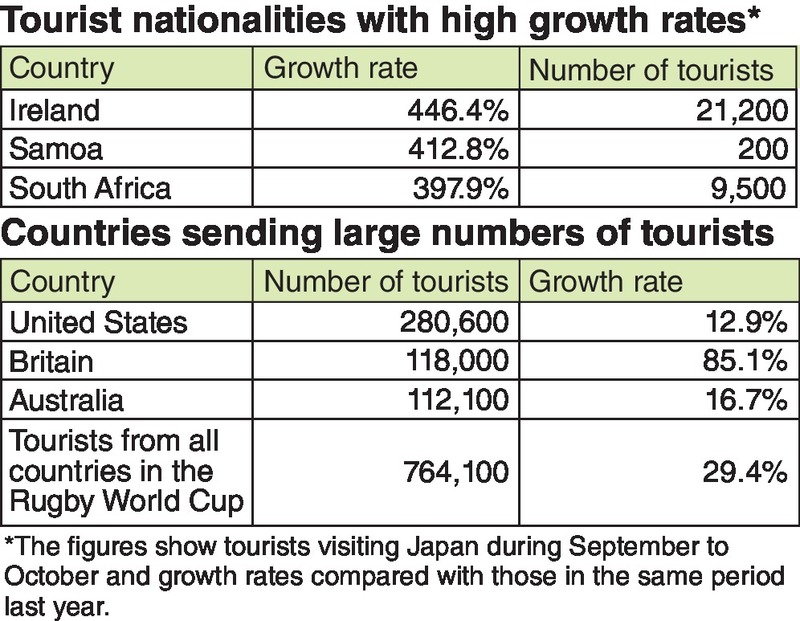 According to a rough estimate, more than 70% of tourists were visiting Japan for the first time, and most tourists stayed for two weeks or more. The World Cup was held from Sept. 20 to Nov. 2 at 12 venues around Japan.