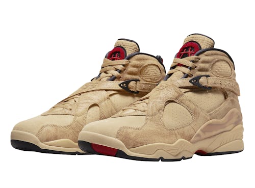 It’s been a couple of months since images of the Hachimura Air Jordan 8 first surfaced, but the shoe’s thoughtful details have made it worth the wait. Appearing in a beige color scheme, the base of the upper is dressed in a smooth “Sesame” shade, while the overlays appear in cracked leather. Bright red accents hit the tongue, heel tab, and part of the outsole.