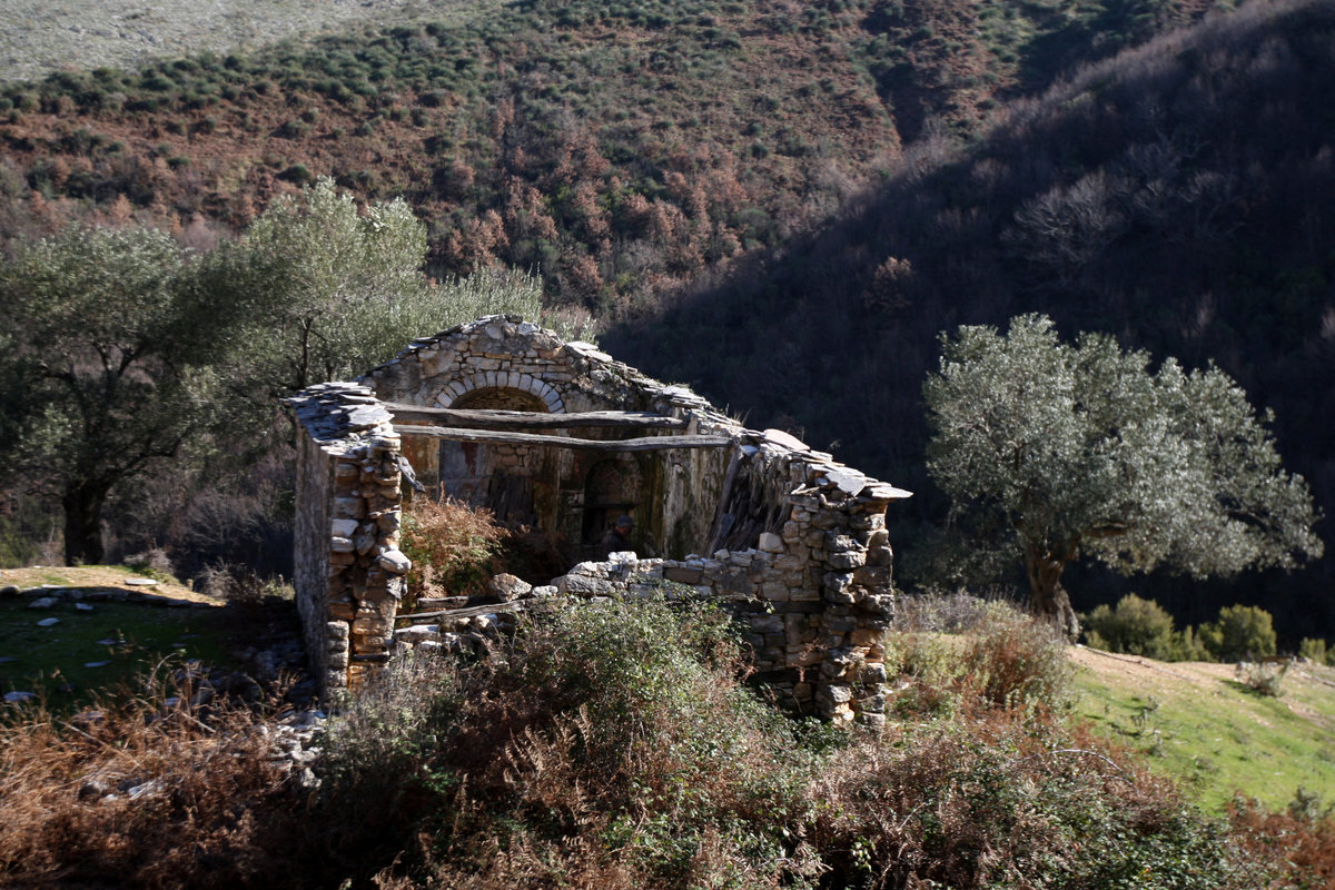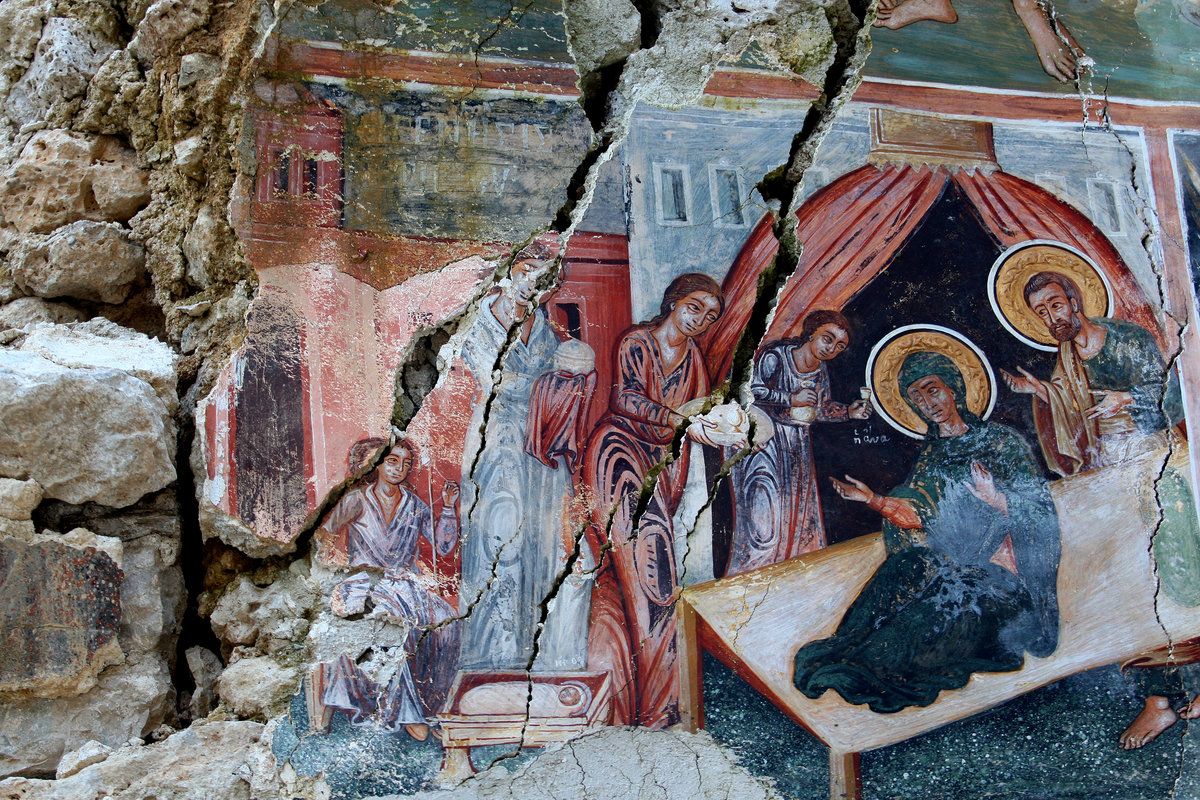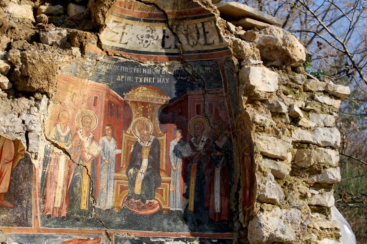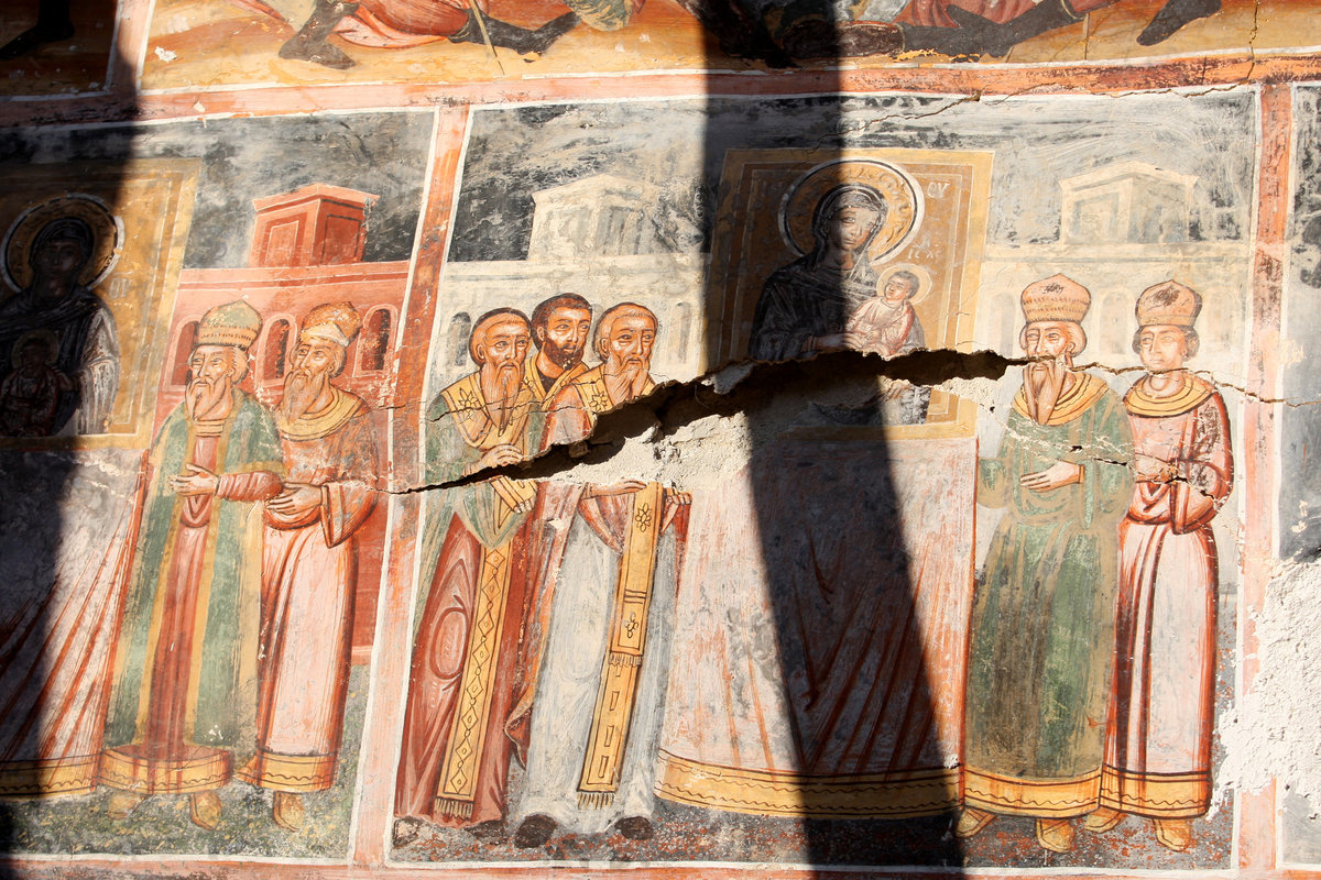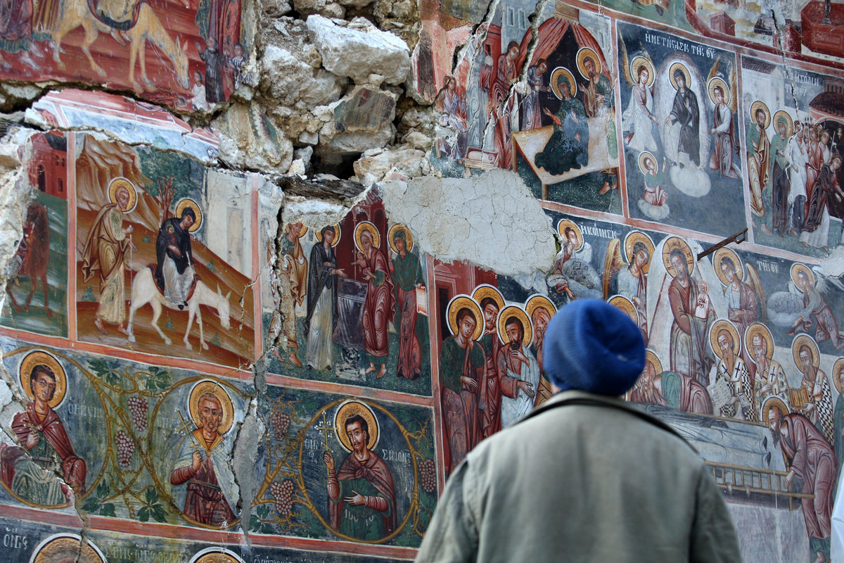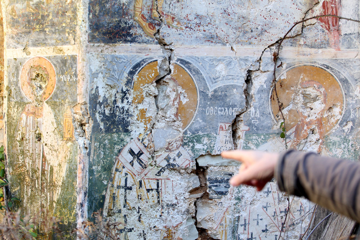The post-Byzantine Saint Athanasius church in Leshnice is one example. Its frescoes have stared at the stars since last May when the roof caved in and its southern wall fell down.