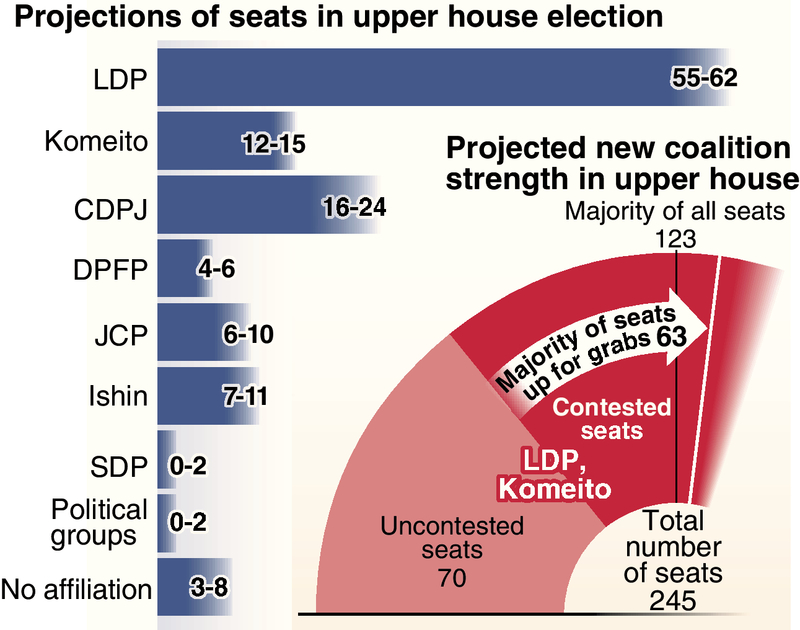 The ruling LDP appears to be on track to win a total of 22 single-seat constituencies, including Fukushima, Yamanashi, Nara and Nagasaki. It also has the advantage in the proportional representation segment. It is expected to win at least one seat in all four constituencies -- Ibaraki, Shizuoka, Kyoto and Hiroshima -- which have two seats up for grabs, and possibly two of the six seats in the Tokyo constituency.