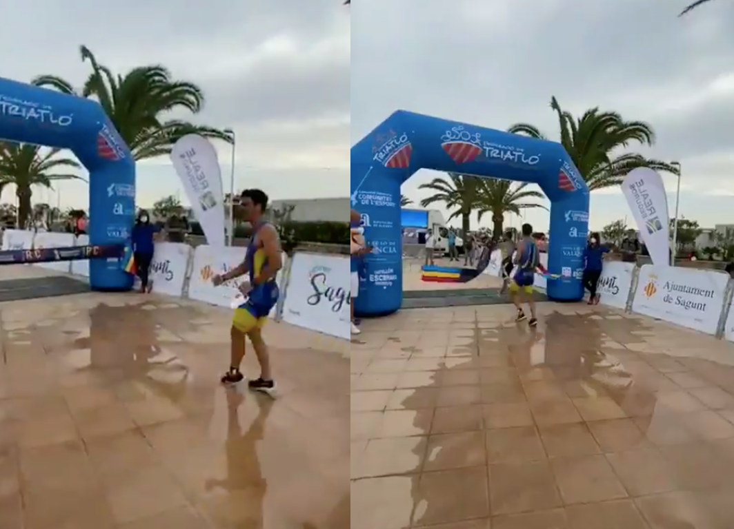 In the clip at the Sagunto triathlon in eastern Spain on Sunday, Mateo Bustos can be seen fist-pumping as it looked like he was going to win.