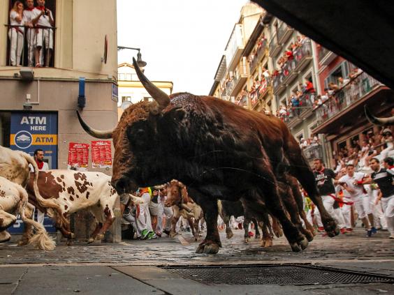Slips and falls, however, were constant by bulls and runners, and some participants were stampeded by the 1,300lbs (590-kilogram) animals on the way to the bullring.