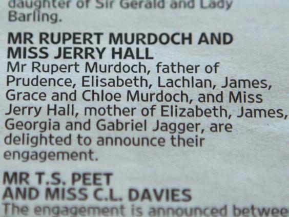 The notice read: "Mr Rupert Murdoch, father of Prudence, Elisabeth, Lachlan, James, Grace and Chloe Murdoch, and Miss Jerry Hall, mother of Elizabeth, James, Georgia and Gabriel Jagger, are delighted to announce their engagement."