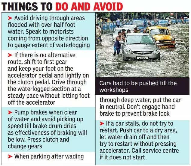 KOLKATA: Motor garages across the city were flooded with cars and bikes that had developed snags and got stranded in waterlogged streets following unprecedented rains on Monday. Scores of cars had to be towed to workshops.