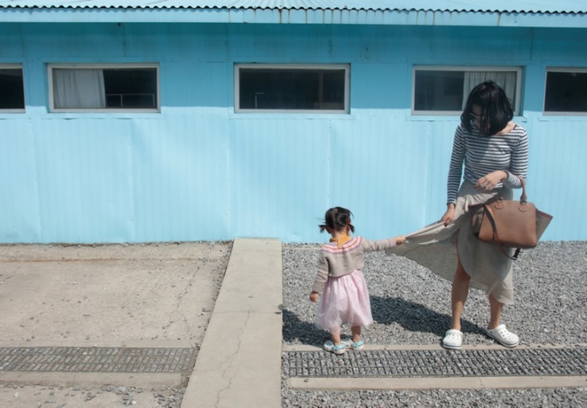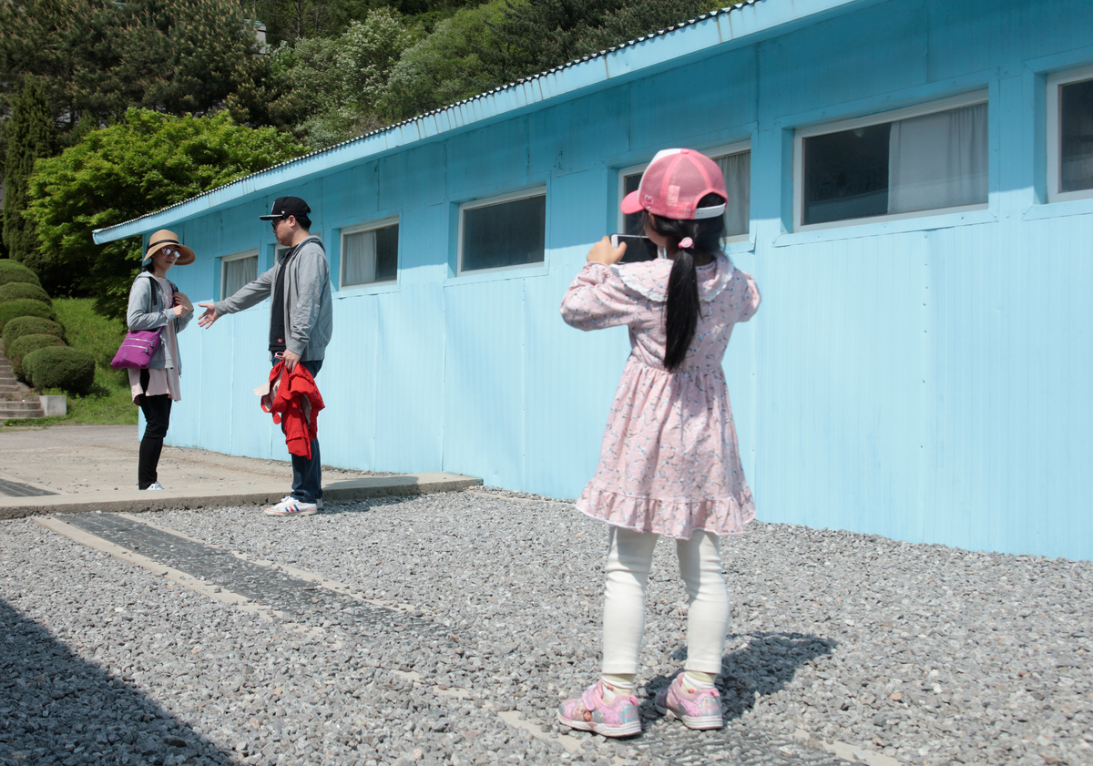 On a recent sunny day, families, couples and even a pet dog roamed the set, smiling and laughing as they mimicked the handshake between Moon and the reclusive Kim.