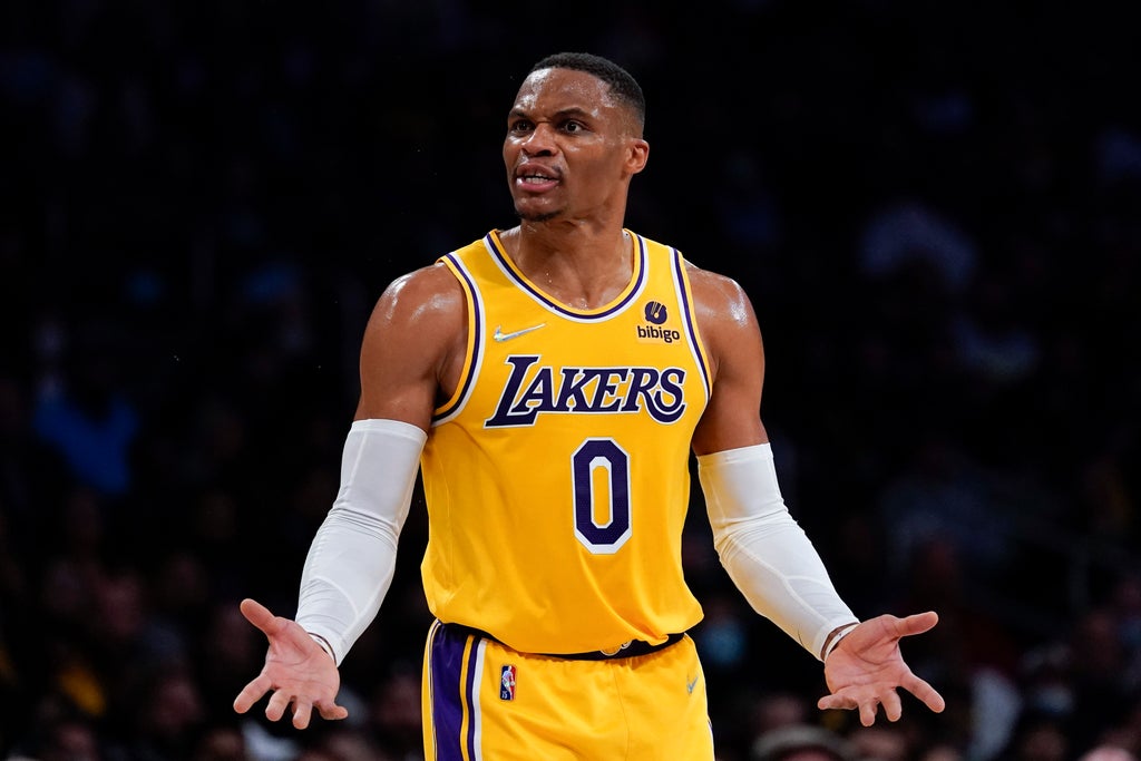 Russell Westbrook posted his first triple-double of the season to help the Los Angeles Lakers sneak past the Charlotte Hornets 126-123 after overtime .