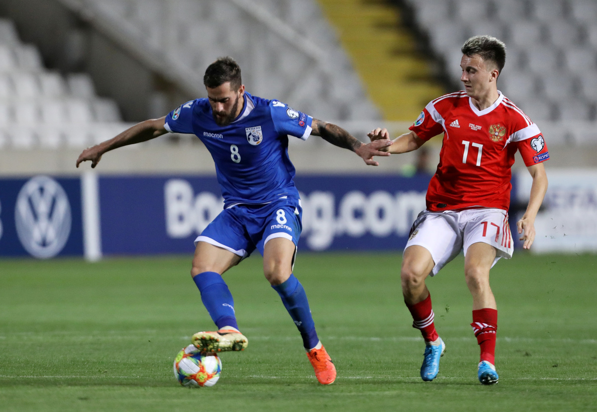 Soccer Football - Euro 2020 Qualifier - Group I - Cyprus v Russia - GSP Stadium, Strovolos, Cyprus - October 13, 2019 Russia's Aleksandr Golovin in action with Cyprus's Charis Kyriakou REUTERS/Yiannis Kourtoglou