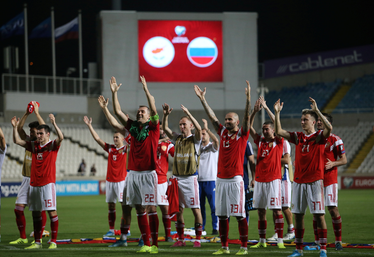 Soccer Football - Euro 2020 Qualifier - Group I - Cyprus v Russia - GSP Stadium, Strovolos, Cyprus - October 13, 2019 Russia's Artem Dzyuba, Fedor Kudryashov and team mates celebrate at the end of the match REUTERS/Yiannis KourtoglouSoccer Football - Euro 2020 Qualifier - Group I - Cyprus v Russia - GSP Stadium, Strovolos, Cyprus - October 13, 2019 Russia coach Stanislav Cherchesov reacts REUTERS/Yiannis KourtoglouSoccer Football - Euro 2020 Qualifier - Group I - Cyprus v Russia - GSP Stadium, Strovolos, Cyprus - October 13, 2019 Russia fan before the match REUTERS/Yiannis KourtoglouSoccer Football - Euro 2020 Qualifier - Group I - Cyprus v Russia - GSP Stadium, Strovolos, Cyprus - October 13, 2019 Russia's Artem Dzyuba celebrates scoring their third goal REUTERS/Yiannis KourtoglouSoccer Football - Euro 2020 Qualifier - Group I - Cyprus v Russia - GSP Stadium, Strovolos, Cyprus - October 13, 2019 Russia's Alexey Ionov during the warm up before the match REUTERS/Yiannis Kourtoglou