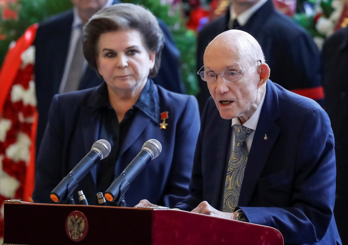 Russian cosmonaut Valentina Tereshkova, the first woman cosmonaut, and former Apollo spacecraft commander Thomas Stafford attend a mourning ceremony and a funeral for Alexei Leonov, the first man to conduct a space walk in 1965, in Mytishchi, outside Moscow, Russia October 15, 2019. REUTERS/Evgenia Novozhenina