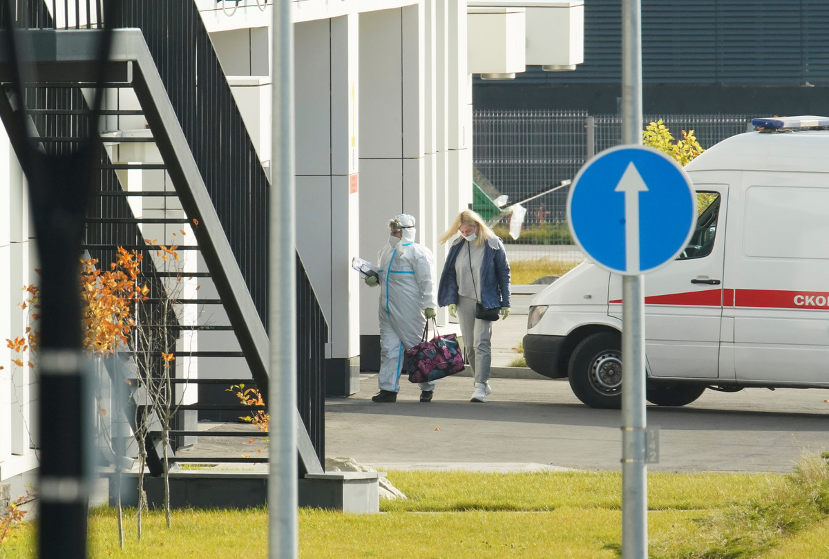 A medical specialist wearing protective gear accompanies a woman outside a hospital for patients infected with the coronavirus disease (COVID-19) on the outskirts of Moscow, Russia October 2, 2020. REUTERS/Tatyana Makeyeva