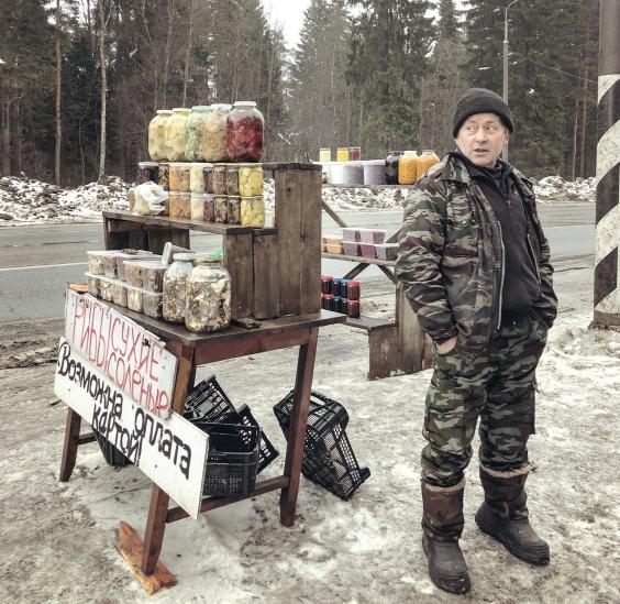 And another few miles on is Mikhail, a medalled Afghan veteran now in the business of selling wild mushrooms. Mushrooms are his life passion — “there aren’t any hallucinogenic ones for you, lad, sorry” — and his eyes sparkle while talking about the preparation process. “You need to see how they are cooked. First you soak them, then, like smoked meat, you salt them in layers, adding seasonings, spices.”