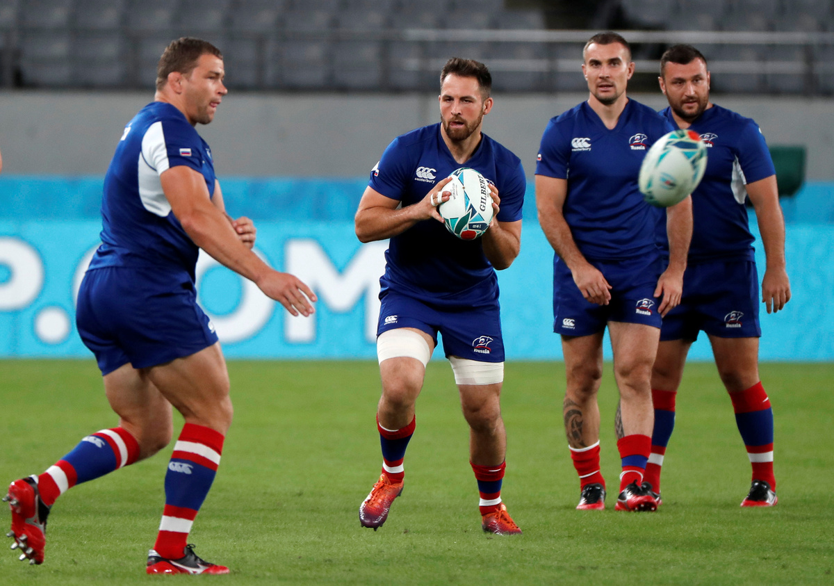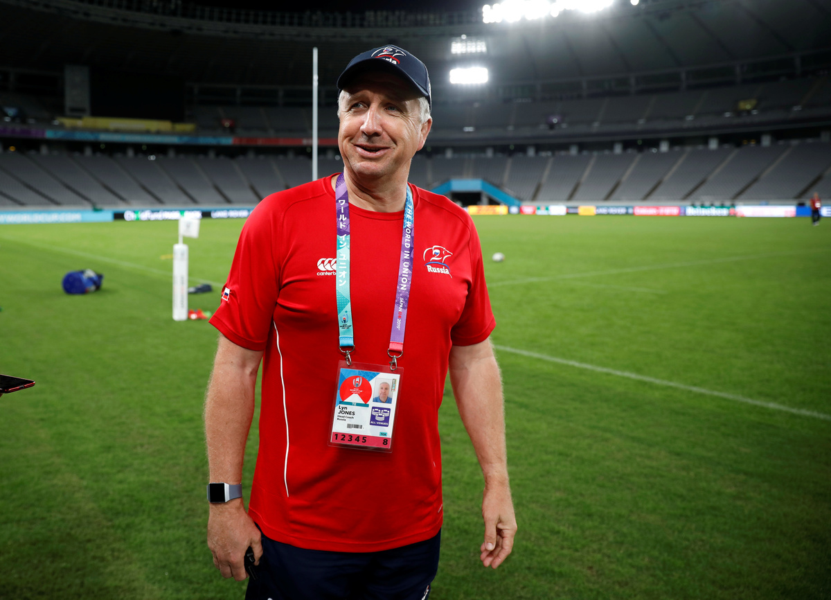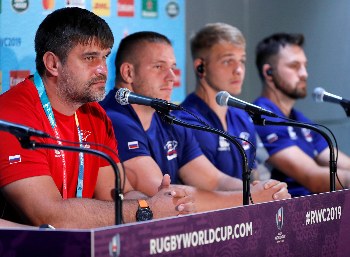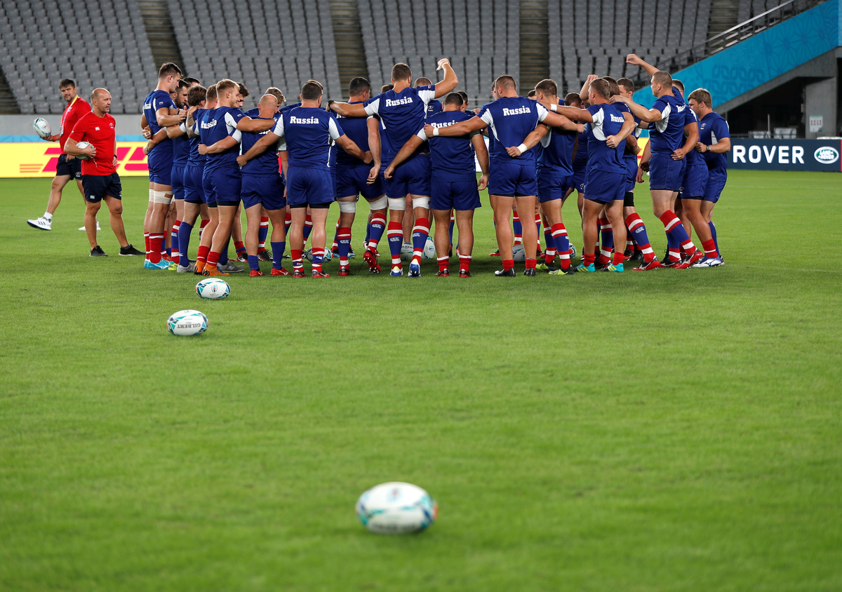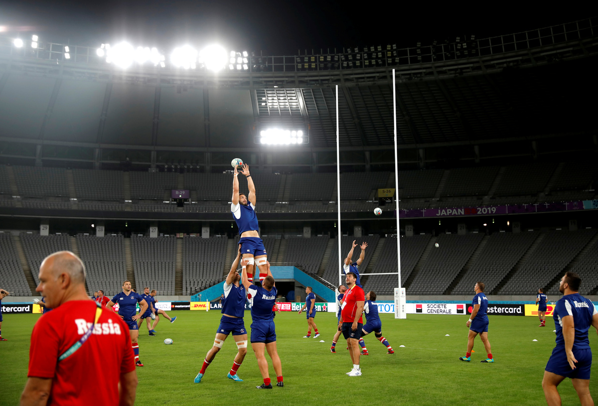 Rugby Union - Rugby World Cup - Russia's Captain's Run - Tokyo Stadium, Tokyo, Japan - September 19, 2019. Russia's team members attend a training session. REUTERS/Issei KatoRugby Union - Rugby World Cup - Russia's Captain's Run - Tokyo Stadium, Tokyo, Japan - September 19, 2019. Russia's team members attend a training session. REUTERS/Issei KatoRugby Union - Rugby World Cup - Russia's Captain's Run - Tokyo Stadium, Tokyo, Japan - September 19, 2019. Japanese and Russian national flags are hoisted. REUTERS/Issei KatoRugby Union - Rugby World Cup - Russia's Captain's Run - Tokyo Stadium, Tokyo, Japan - September 19, 2019. Russia's assistant coach Alexander Voytov and other team members attend a news conference. REUTERS/Issei KatoRugby Union - Rugby World Cup - Russia's Captain's Run - Tokyo Stadium, Tokyo, Japan - September 19, 2019. Russia rugby team head coach Lyn Jones during a training session. REUTERS/Issei Kato