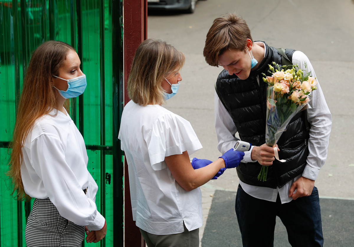 A student has his temperature checked on the first day of the new school year, as schools reopen after the summer break and the lockdown due to the outbreak of the coronavirus disease (COVID-19), in Moscow, Russia September 1, 2020. REUTERS/Evgenia Novozhenina