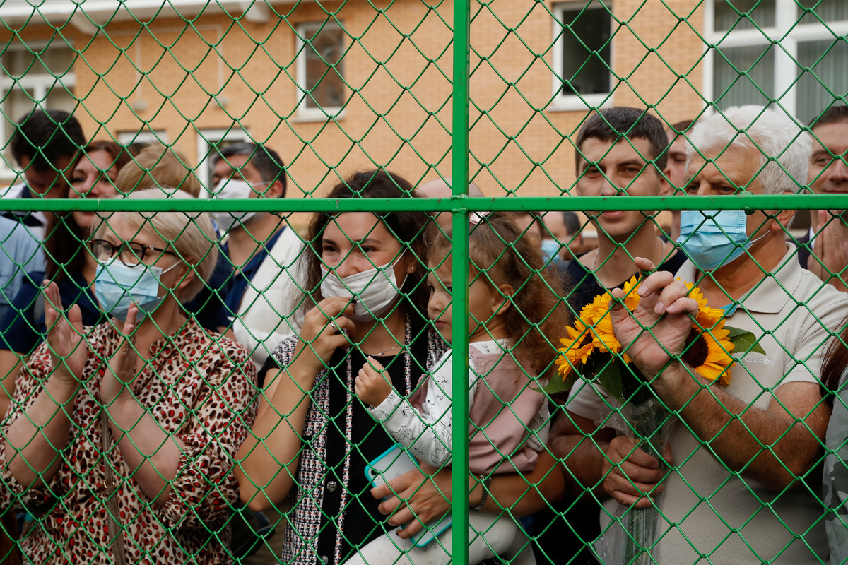 Relatives watch from behind a fence as first graders attend a ceremony marking the start of the new school year, as schools reopen after the summer break and the lockdown due to the outbreak of the coronavirus disease (COVID-19), in Moscow, Russia September 1, 2020. REUTERS/Evgenia Novozhenina