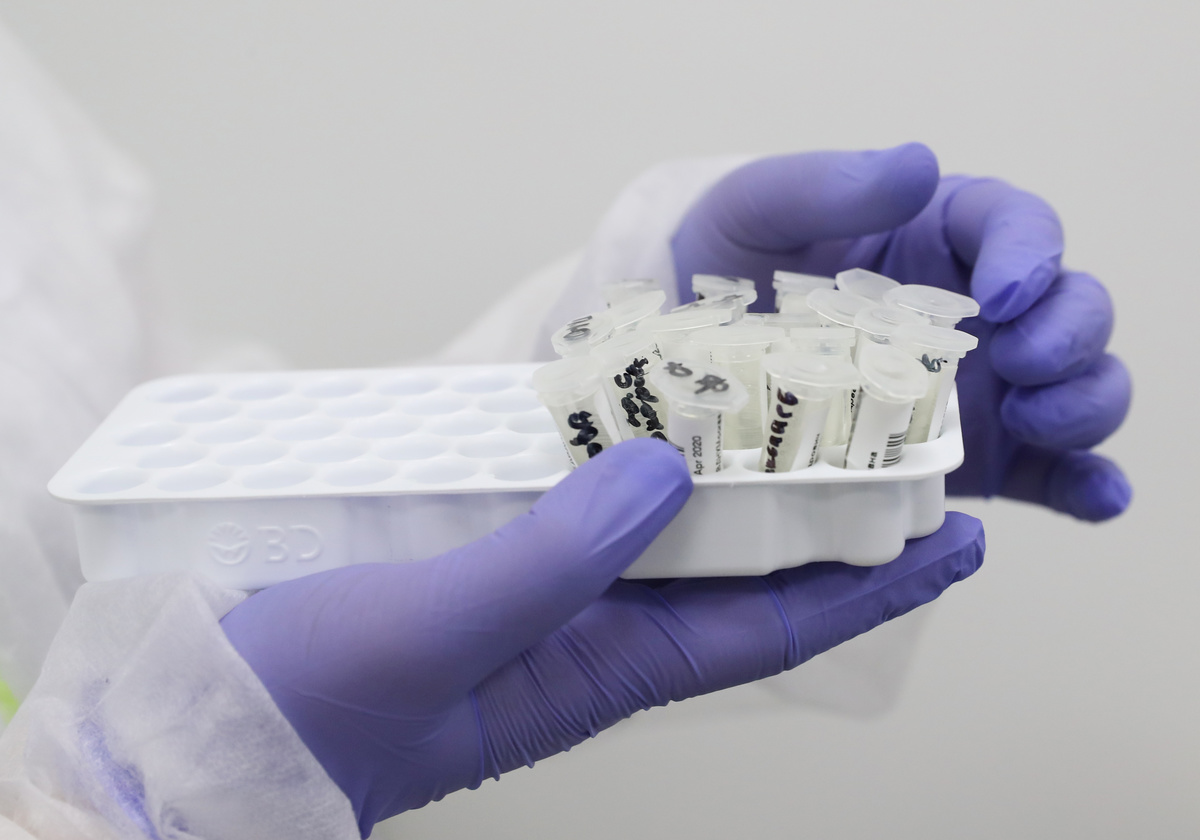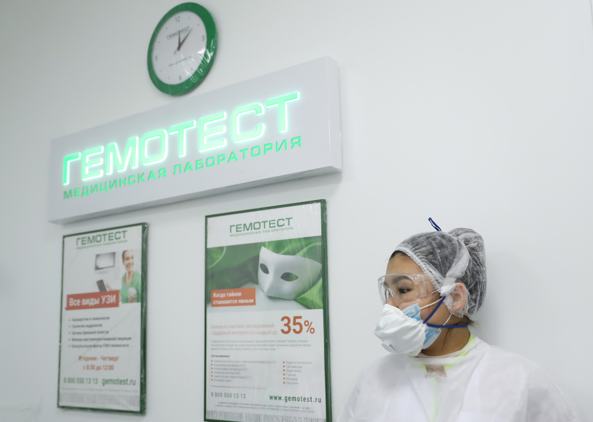A health worker wearing protective gear holds samples taken for testing for the coronavirus disease (COVID-19) at Gemotest laboratory in Moscow, Russia April 6, 2020. REUTERS/Evgenia Novozhenina