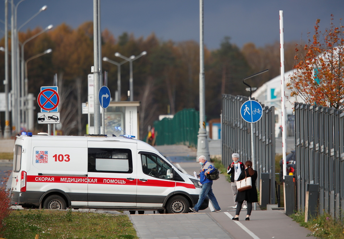 An ambulance is seen near a hospital for patients infected with the coronavirus disease (COVID-19) on the outskirts of Moscow, Russia October 23, 2020. REUTERS/Maxim Shemetov