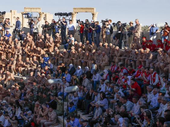Thursday’s concert came amid accusations that the Syrian regime made a deal with Isis to hand back the symbolic city, as well as continued civilian deaths in air strikes blamed on Russia’s ally Bashar al-Assad.