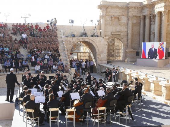 A world-renowned orchestra has played a concert in the ruins of Palmyra as Russia put on a triumphant display for servicemen, officials and journalists a month after Isis was driven from the city.