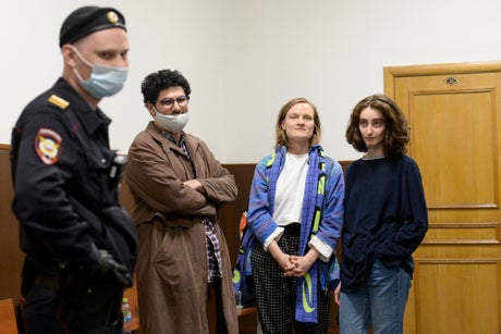 A court on Wednesday afternoon was set to decide on pre-trial restrictions for the DOXA editors. Dozens of supporters gathered in front of the courthouse in central Moscow; many carried banners saying “We are DOXA” and “Get your hands away from DOXA.”