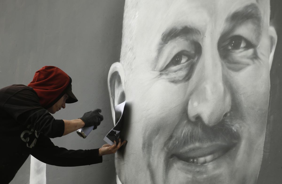 Ilya Is, street artist from the Hoodgraff team, paints a graffiti art depicting Russia's national team coach Stanislav Cherchesov in central St. Petersburg, the host city for the 2018 FIFA World Cup, Russia June 21, 2018. REUTERS/Anton Vaganov