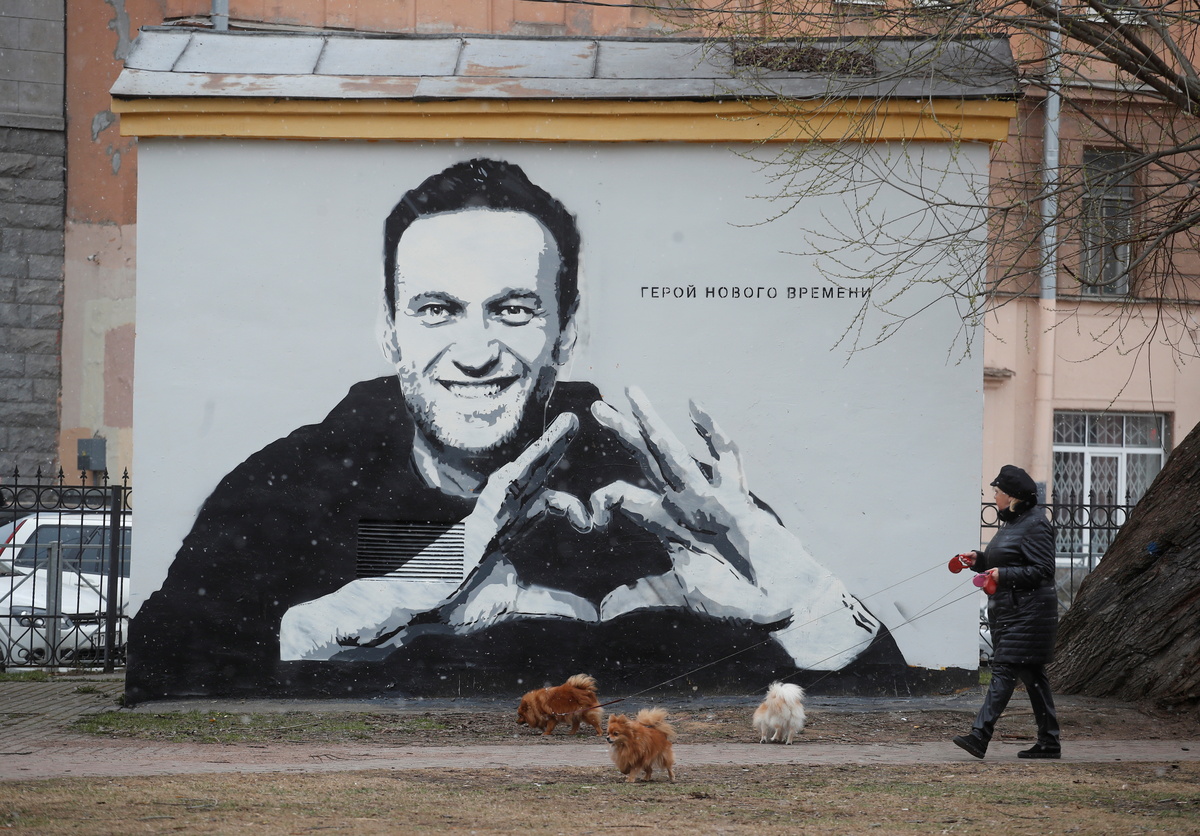 The mural in President Vladimir Putin's hometown showed a smiling Navalny, whose activist network is on the brink of being outlawed as "extremist", making a heart shape with his hands next to the slogan "A hero of a new time".