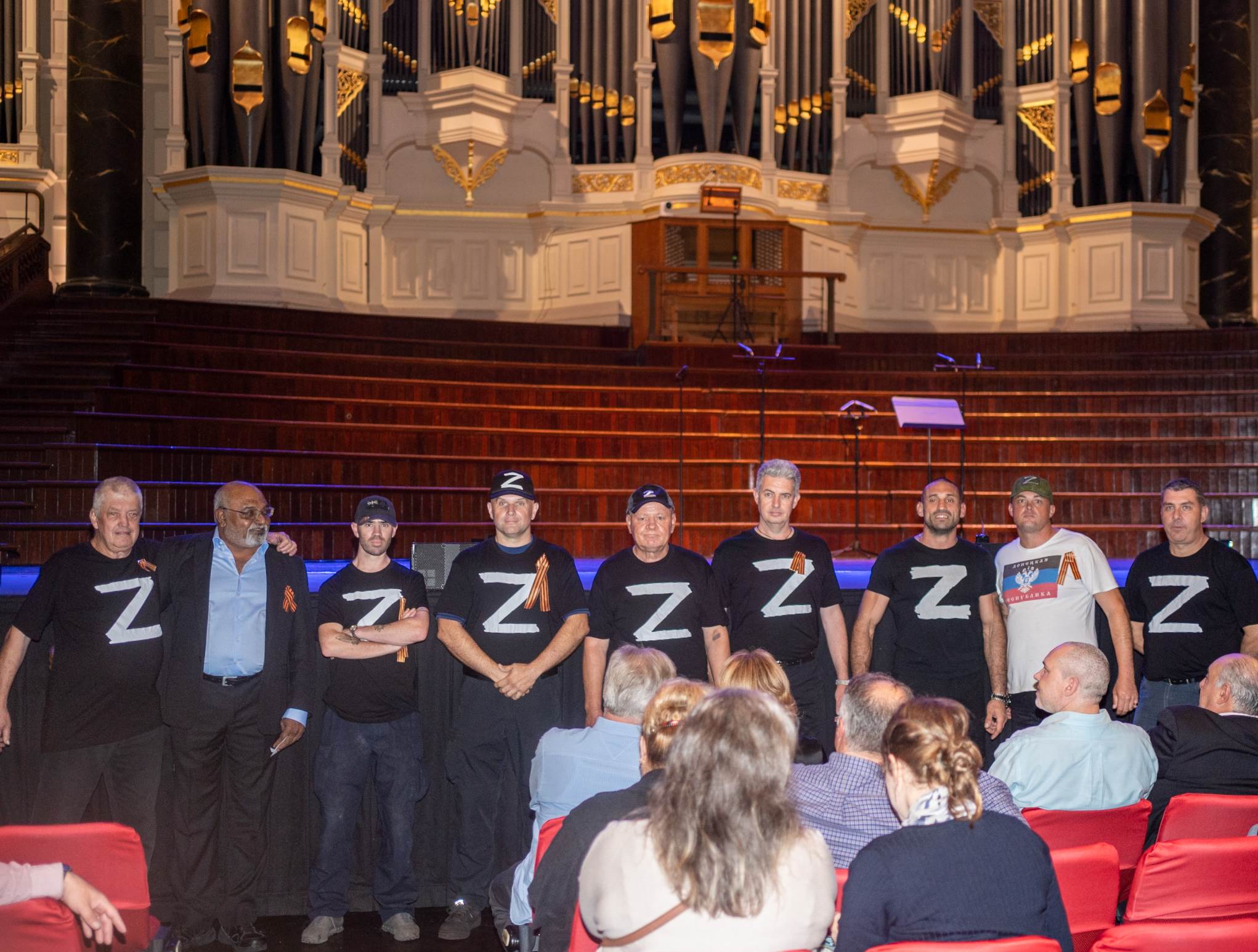 Several men wearing shirts with the letter Z — a symbol representing support for Russian President Vladimir Putin's invasion of Ukraine — gathered at the front of Sydney Town Hall following a performance of the Russian Orthodox Male Choir on Friday night.