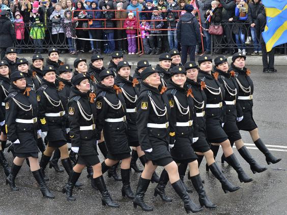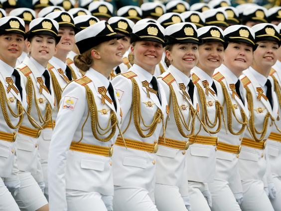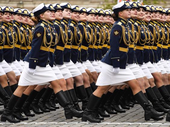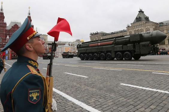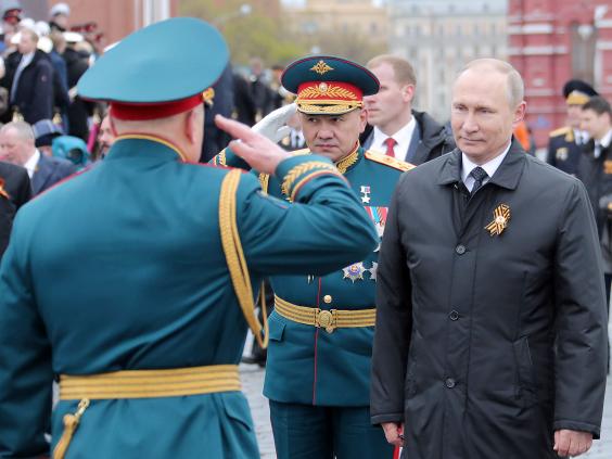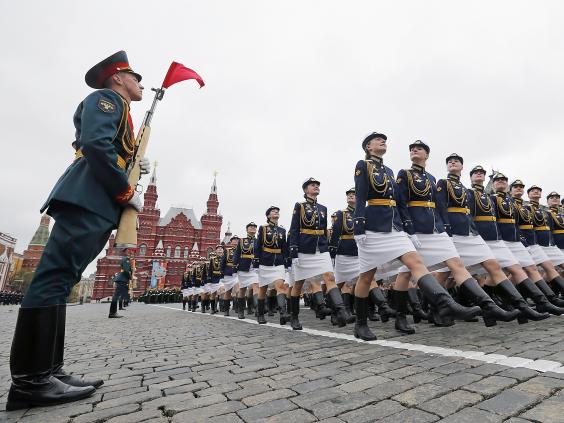 About 10,000 soldiers participated, standing rigidly as Defense Minister Sergei Shoigu reviewed them from an open-top limousine. The soldiers then marched out to make way for a display of military vehicles ranging from armored cars to lumbering Topol intercontinental ballistic missile launchers.