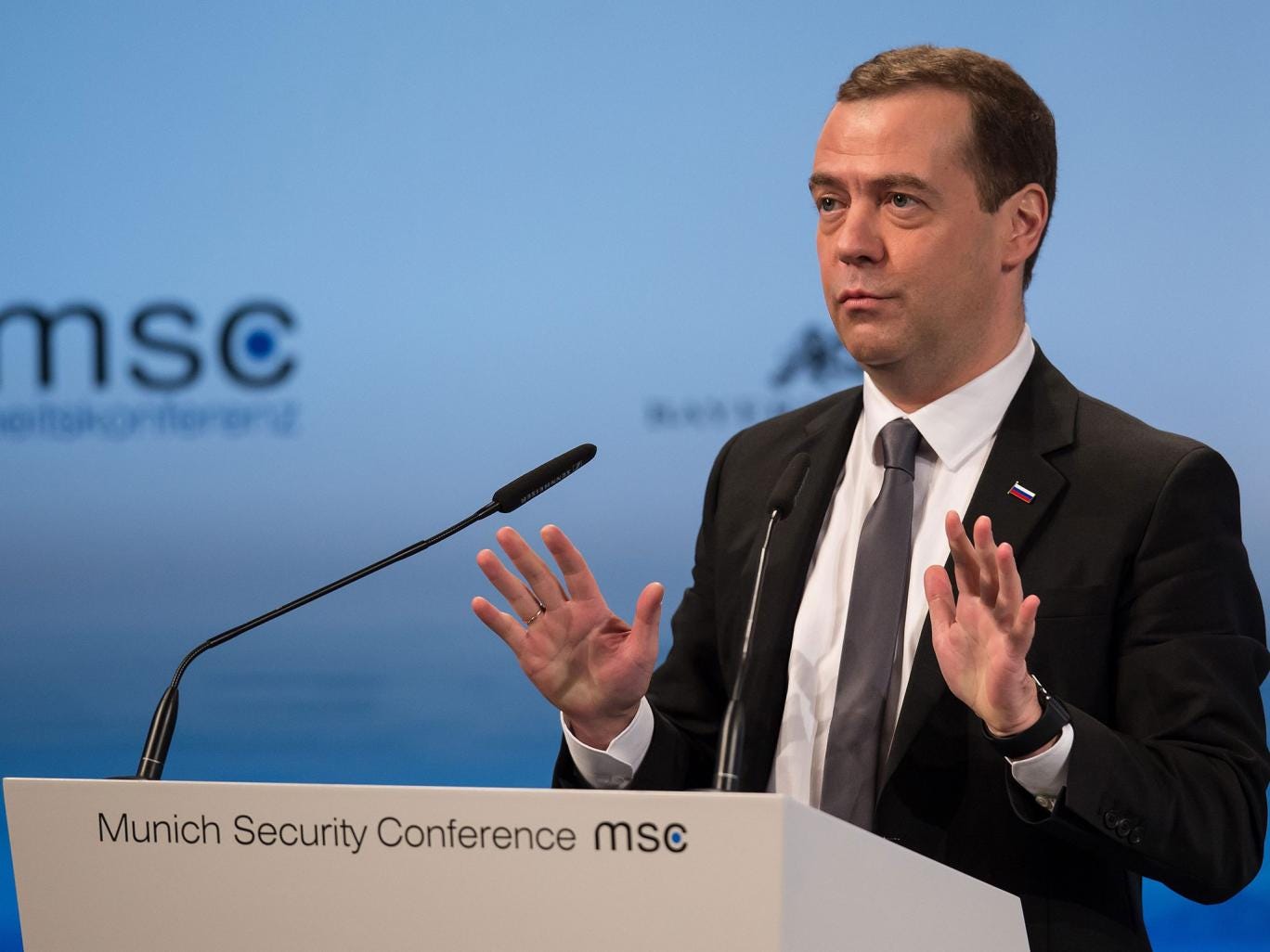 Dmitry Medvedev spoke at the Munich Security Conference shortly before John Kerry, the US Secretary of State, accused Russia of “repeated aggression” and killing civilians.