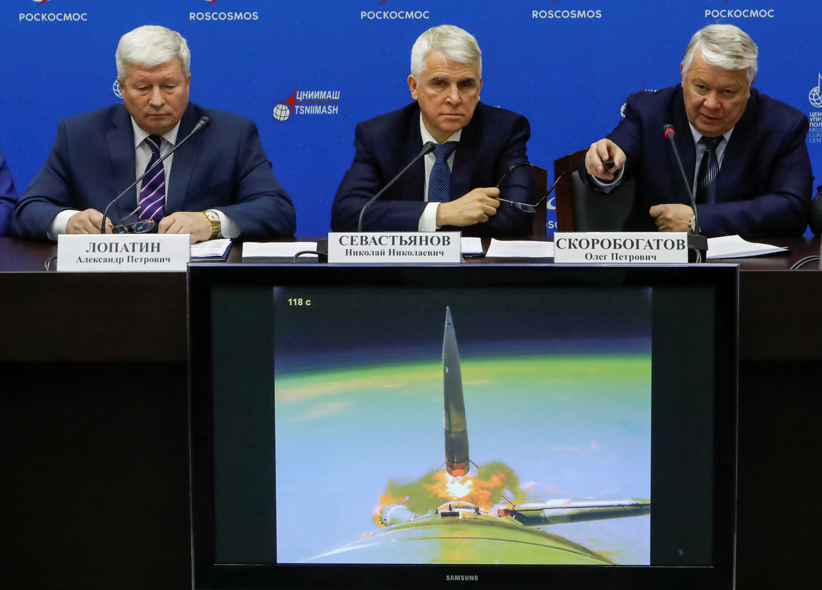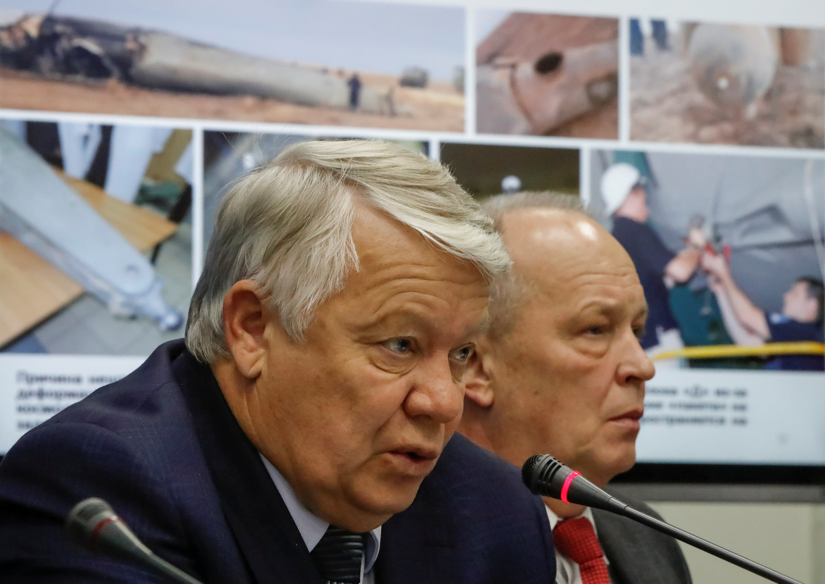 Oleg Skorobogatov, head of the investigating commission, speaks at a news conference on the results of the investigation on the failed Soyuz rocket launch on October 11, in the Russian Mission Control Center in Korolev, outside Moscow, Russia November 1, 2018. REUTERS/Sergei KarpukhinPeople stay in front of a screen showing a picture of the International Space Station (ISS) before a news conference on results of investigation on failed Soyuz rocket launch on October 11, in the Russian Mission Control Center in Korolev, outside Moscow, Russia November 1, 2018. REUTERS/Sergei KarpukhinOleg Skorobogatov, head of the investigating commission, attends a news conference on the results of the investigation on the failed Soyuz rocket launch on October 11, in the Russian Mission Control Center in Korolev, outside Moscow, Russia November 1, 2018. REUTERS/Sergei KarpukhinThe Soyuz 2.1b rocket carrying a military spacecraft takes off from the Plesetsk cosmodrome in Arkhangelsk region, Russia October 25, 2018. Russian Defence Ministry Press Service/Handout via REUTERS