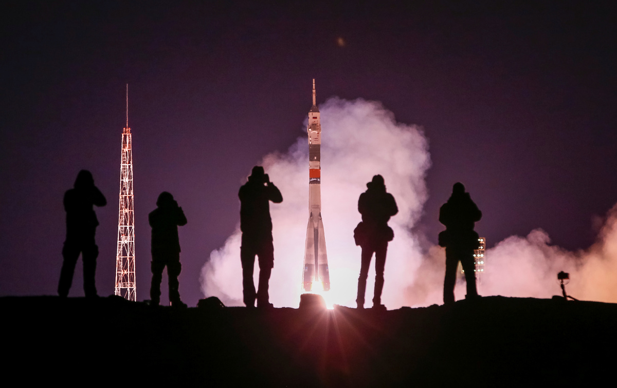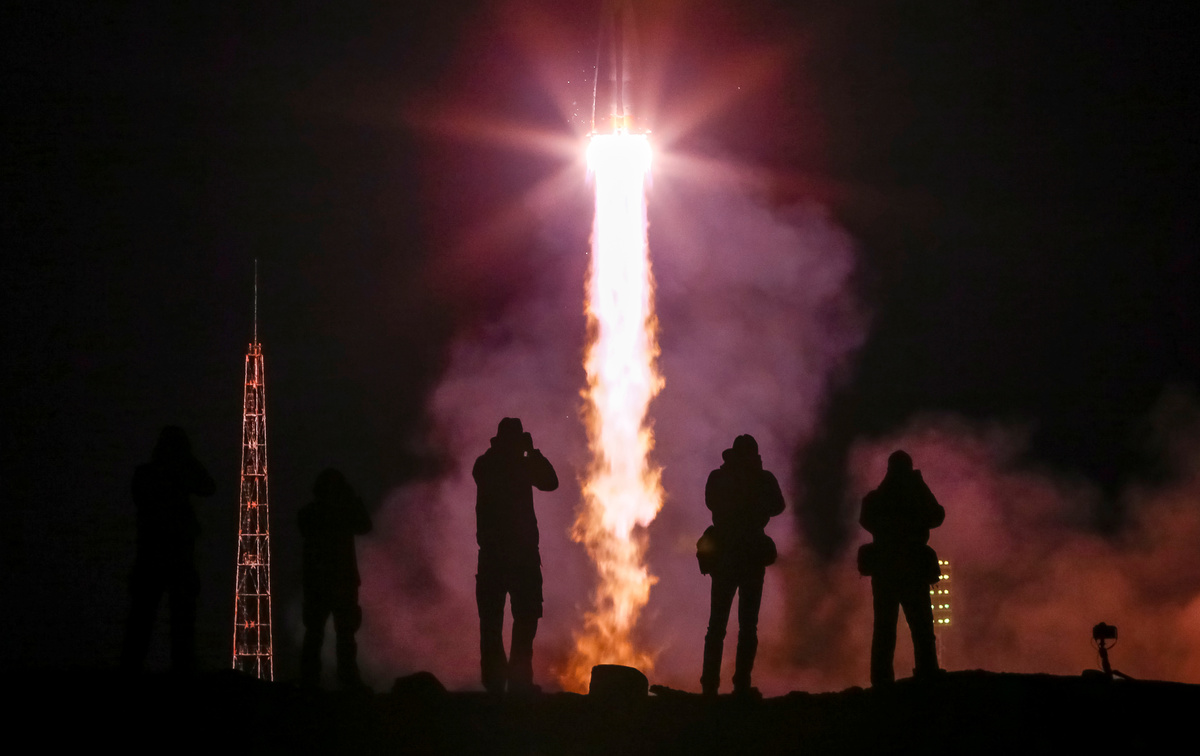 Photographers take pictures as the Soyuz MS-12 spacecraft carrying the crew formed of Aleksey Ovchinin of Russia, Nick Hague and Christina Koch of the U.S. blasts off to the International Space Station (ISS) from the launchpad at the Baikonur Cosmodrome, Kazakhstan March 15, 2019. REUTERS/Shamil Zhumatov
