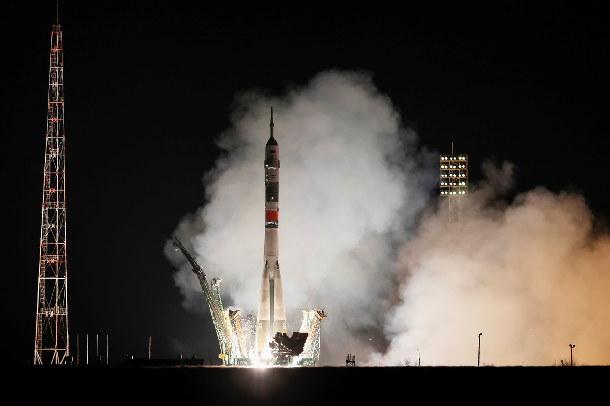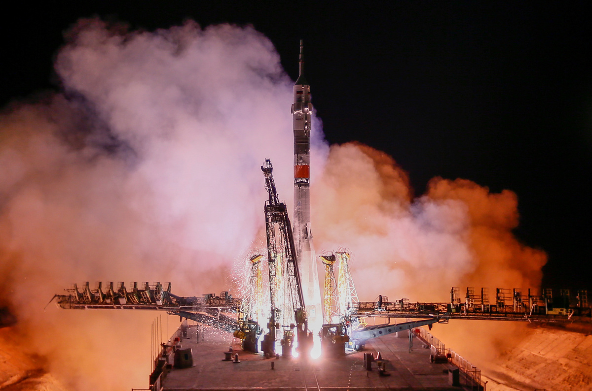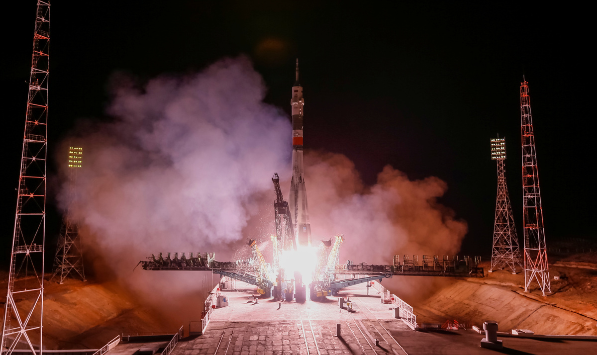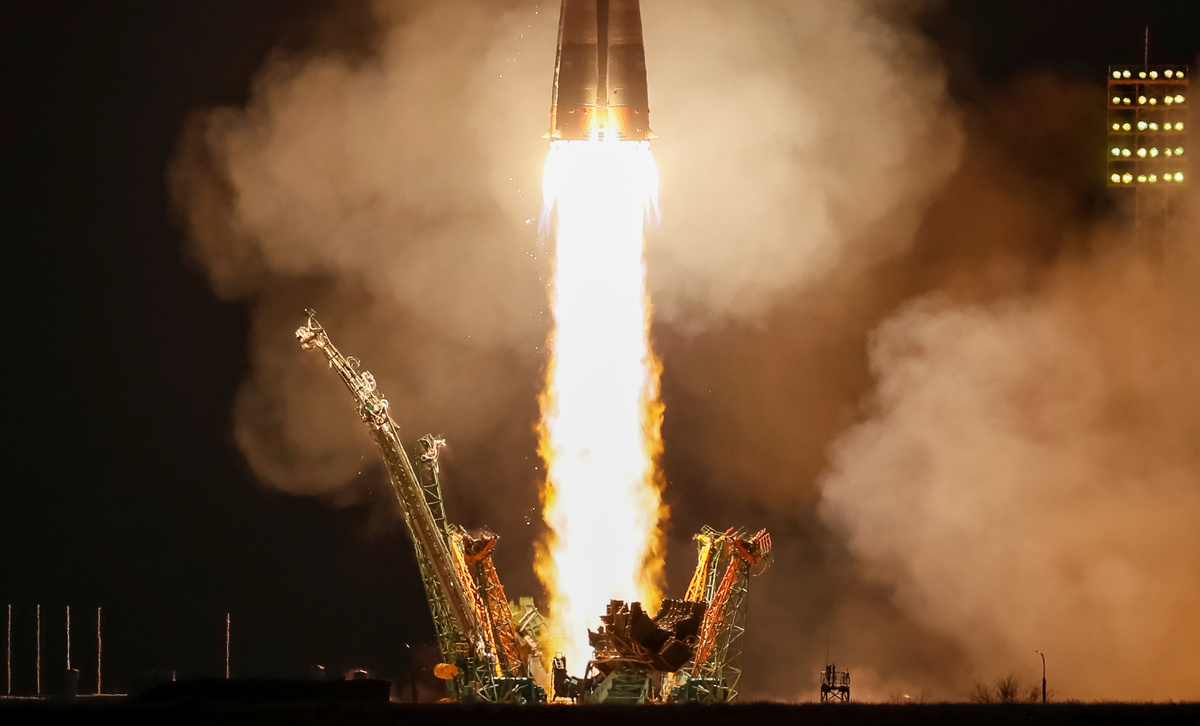 The Soyuz MS-12 spacecraft carrying the crew formed of Aleksey Ovchinin of Russia, Nick Hague and Christina Koch of the U.S. blasts off to the International Space Station (ISS) from the launchpad at the Baikonur Cosmodrome, Kazakhstan March 15, 2019. REUTERS/Shamil Zhumatov