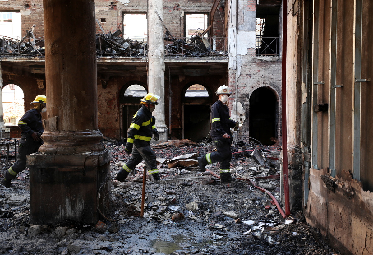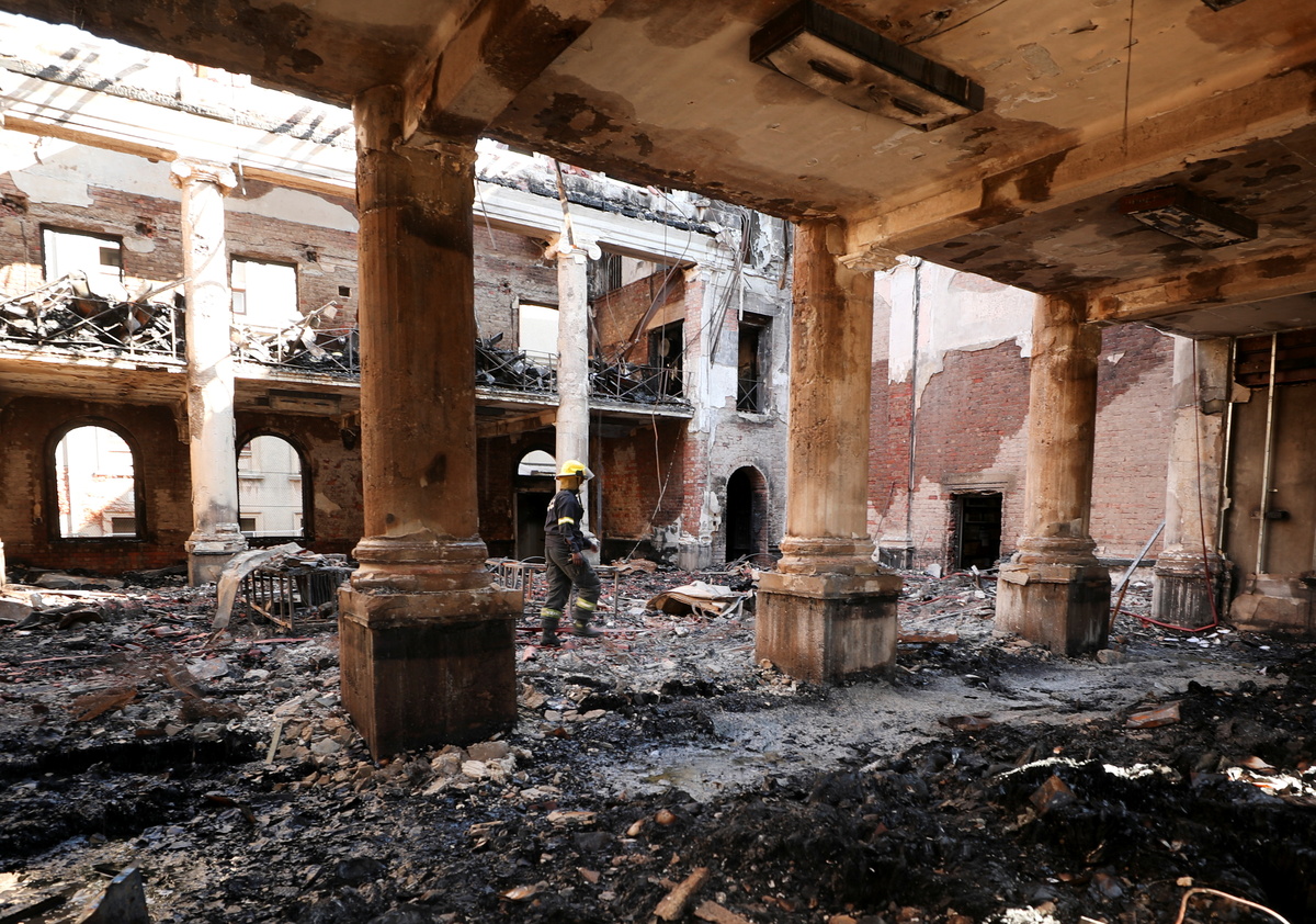 Inside the library, mangled iron works from the collapsed roof hung haphazardly over rows of charred books, some still smouldering, with wisps of smoke as water seeped into every nook.